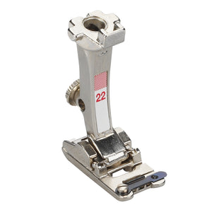 Durch seinen schwenkbaren Riegel an der Oberseite hält der Schnürchenfuss mit 3 Rillen Nr. 22 die Kordeln sicher an ihrem Platz und verhindert ein Verwickeln der Garne beim Nähvorgang.