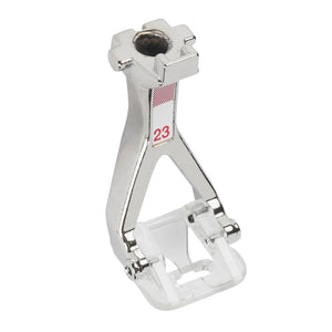 Der Applikationsfuss Nr. 23 ist optimal für einfaches Applizieren einer schmalen Raupennaht bis 2 mm. Die speziell geformte und transparente Fusssohle bietet perfekte Sicht auf den Nähbereich und transportiert dicht genähte Stiche problemlos sowohl gerade Linien als auch Kurven.