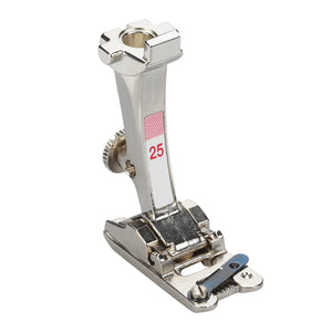 Der Schnürchenfuss Nr. 25 mit 5 Rillen ist ein praktischer Helfer zum gleichzeitigen Aufnähen von mehreren parallel verlaufenden Garnen. Durch die Lasche werden die Garne gerade gehalten und brauchen dadurch keine Führung.