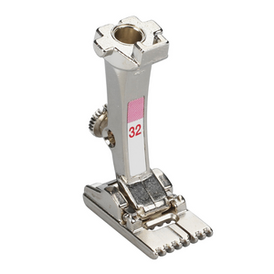 Der Biesenfuss Nr. 32 mit 7 Rillen ist ein Spezialist für das Nähen von besonders feinen Biesen auf leichten bis mittelschweren Stoffen mithilfe einer Zwillingsnadel.