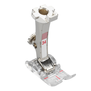 Der Rücktransportfuss mit transparenter Sohle Nr. 34 ist ein echter Allrounder. Er eignet sich für viele vor- und rückwärts transportierende Nutz- und Dekorstiche und wird gerne für allgemeine, grosse und kleine Nähprojekte eingesetzt.