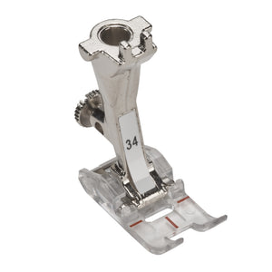 Der Rücktransportfuss mit transparenter Sohle # 34 bietet freie Sicht auf Nadel und Nähbereich. Mithilfe der roten Markierungen auf der Fussoberseite ermöglicht er ein besonders genaues und sorgfältiges Arbeiten. Der Rücktransportfuss mit transparenter Sohle # 34 ist ein echter Allrounder. Er eignet sich für viele vor- und rückwärts transportierende Nutz- und Dekorstiche und wird gerne für allgemeine, grosse und kleine Nähprojekte eingesetzt.