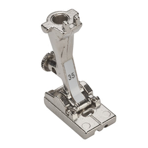 Der Reissverschlussfuss # 35 ist ideal zum Einnähen von verdeckten Reissverschlüssen an Kleidungsstücken. Der Reissverschluss wird so durch die Naht verdeckt, dass er unsichtbar ist. Besonders geeignet für Röcke und Kleider oder elegante Hosen. Zwei schräge Rillen dienen als Führung und ermöglichen ein einfaches Arbeiten im Vergleich zu herkömmlichen Einnähmethoden. Die Rillen liegen beim Reissverschlussfuss # 35 an der Unterseite. Die Spiralen des Reissverschlusses laufen ganz einfach in den Rillen auf der Unterseite des Reissverschlussfusses #35.