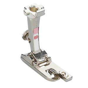 Der Muschel- und Tricotsäumer Nr. 69 ist ein spezieller Nähfuss zum Säumen von weichen Stoffen wie Tricotware. Er schlägt den Stoff mithilfe einer Schnecke zweifach ein und hält ihn mit seiner Führungsschiene in der Fusssohle bis zum Nähen sicher zusammen.