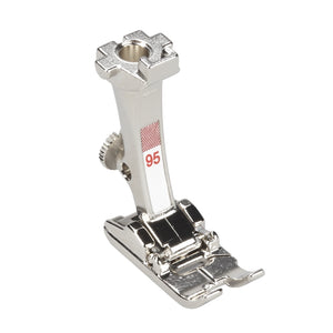 Der Bandeinfasserfuss Nr. 95 ist ein spezieller Nähfuss für das Arbeiten mit Bandeinfassern für vorgefalzte und nicht vorgefalzte Bänder. Durch seinen besonderen Aufbau unterstützt und erleichtert er das Nähen mit dem Bandeinfasser Nr. 87 und Nr. 88.