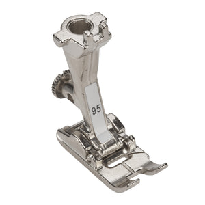Der Bandeinfasserfuss # 95 ist ein spezieller Nähfuss für das Arbeiten mit Bandeinfassern für vorgefalzte und nicht vorgefalzte Bänder. Durch seinen besonderen Aufbau unterstützt und erleichtert er das Nähen mit dem Bandeinfasser # 87 und # 88.