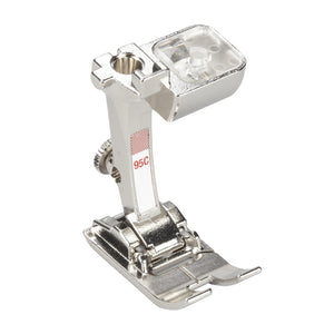 Der Bandeinfasserfuss Nr. 95C ist besonders für das Arbeiten mit Bandeinfassern für vorgefalzte und nicht vorgefalzte Bänder geeignet. Aufgrund seiner speziellen Form hilft und entlastet er das Nähen mit dem Bandeinfasser Nr. 87 und Nr. 88.