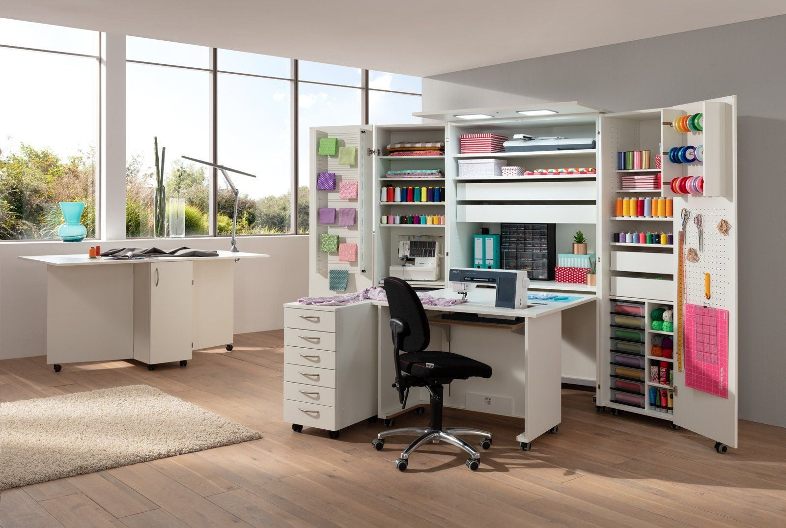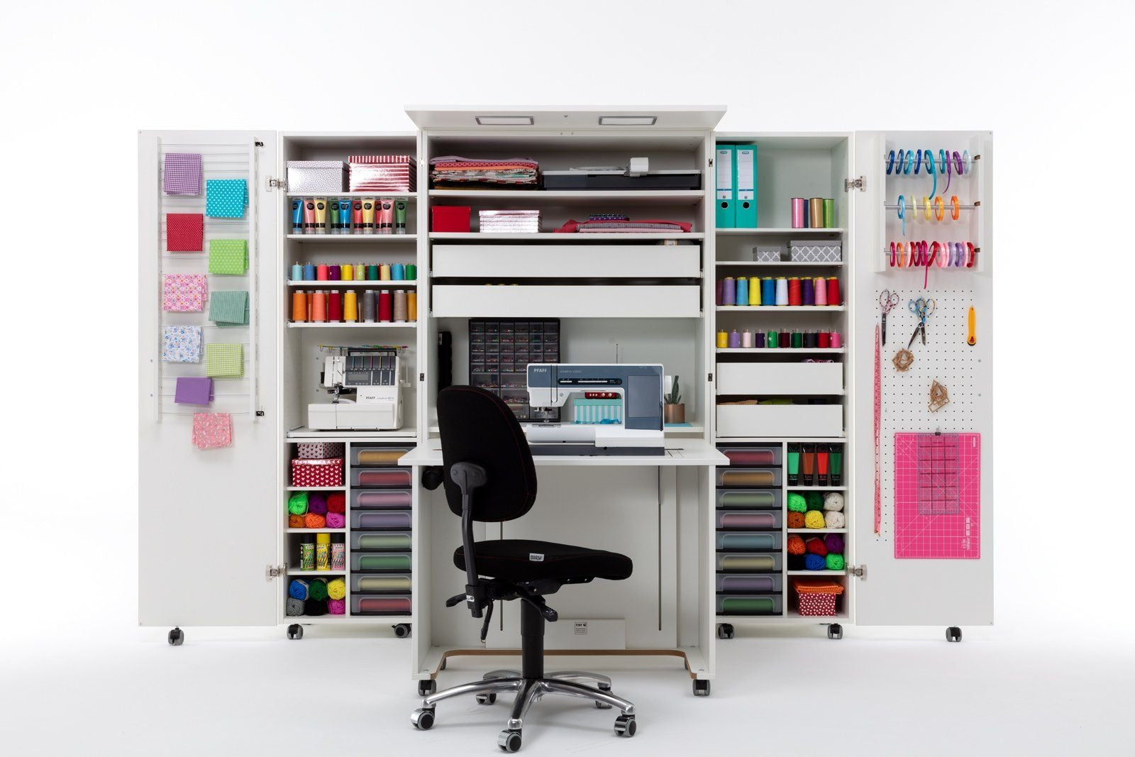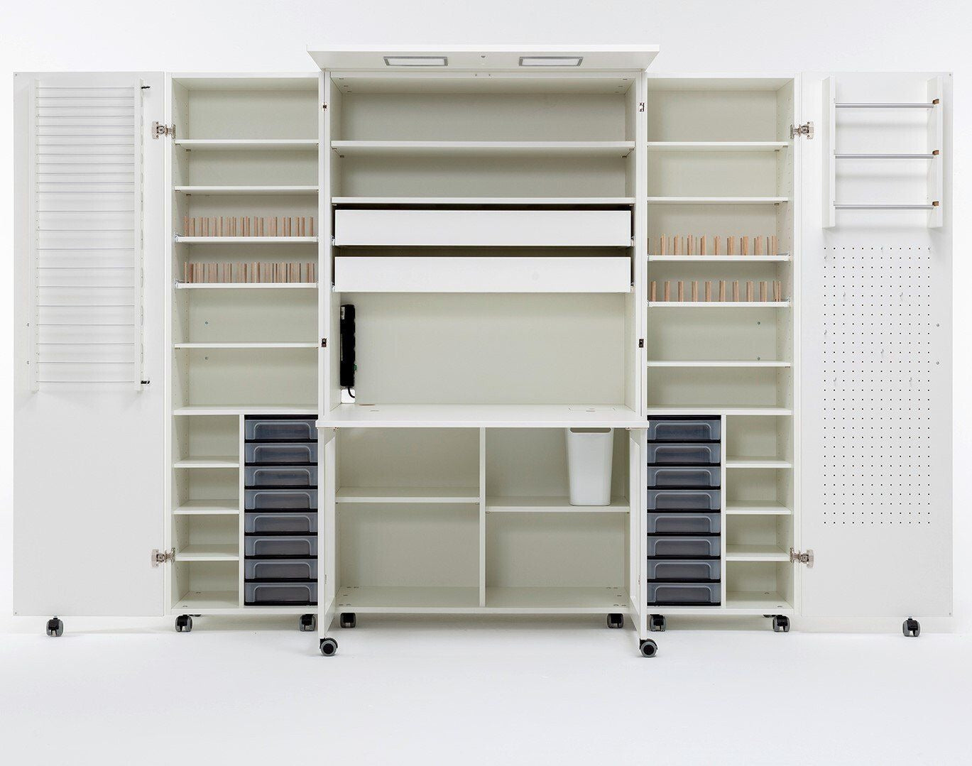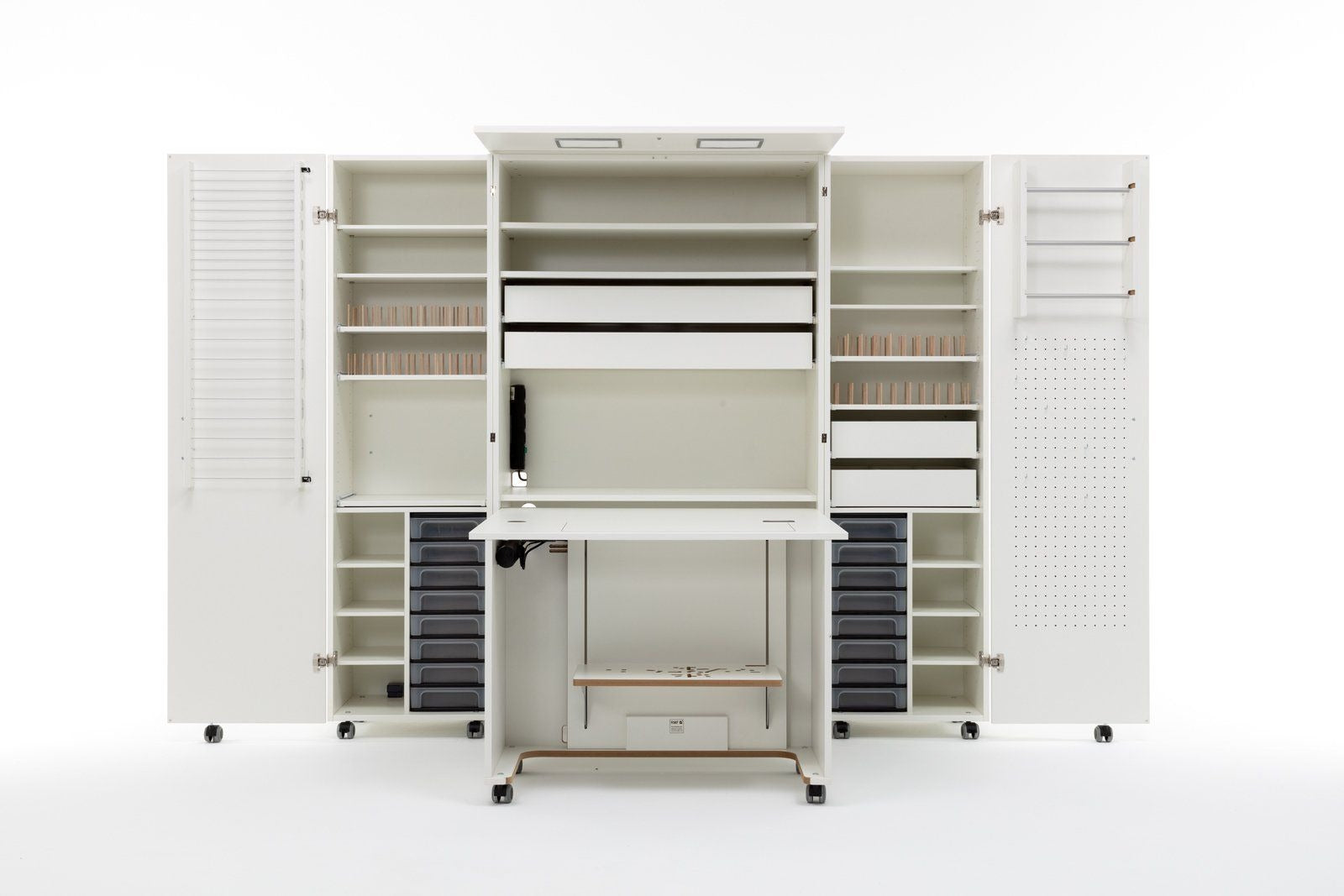 Die CUBO-Serie mit dem WOW–Effekt, hier als flexibeler CUBO sew flex. Die große klappbare und fixierbare Nähtischfläche bietet Ihnen genügend Platz zum Nähen, Basteln, Zuschneiden und vielem mehr. Die hinten links eingebauten 4-Fach-Steckerleisten mit Rückseitiger Kabeldurchführung bietet Ihnen alle nötigen Stromanschlüsse im Möbel. Für Näharbeiten mit schweren vibrierenden Maschinen bieten wir Ihnen die Option eines verstärkenden Metall-Vierkantrohres, welches unter die Platte montiert wird oder im Nachhinein montiert werden kann.