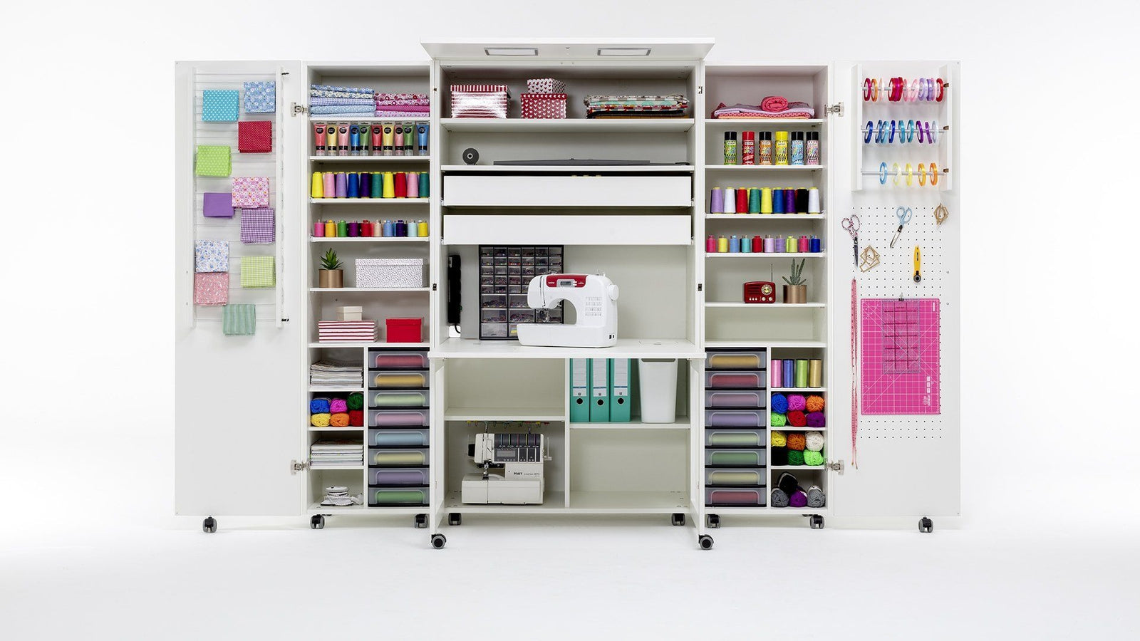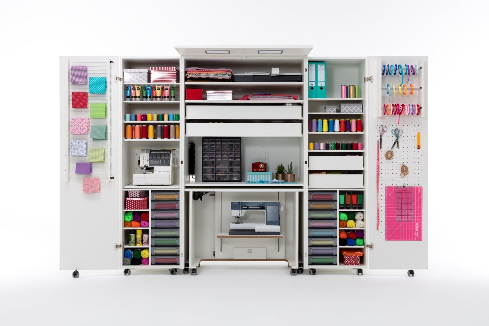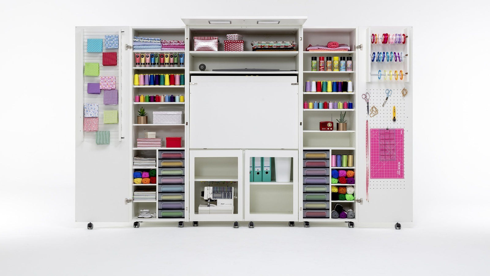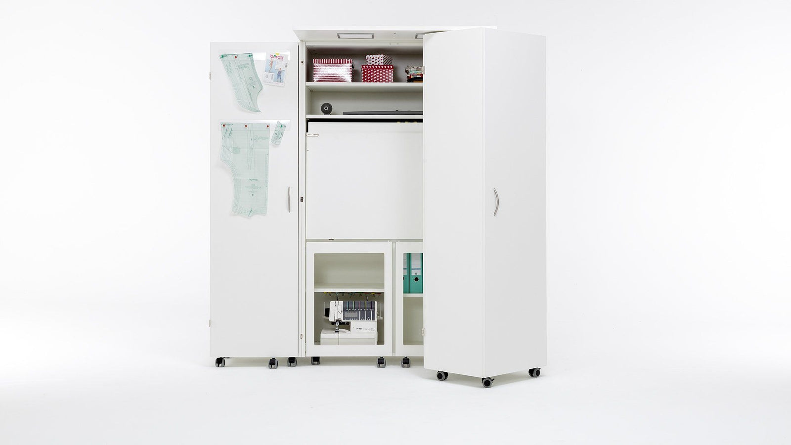 Die CUBO-Serie mit dem WOW–Effekt, hier als flexibeler CUBO sew flex. Die große klappbare und fixierbare Nähtischfläche bietet Ihnen genügend Platz zum Nähen, Basteln, Zuschneiden und vielem mehr. Die hinten links eingebauten 4-Fach-Steckerleisten mit Rückseitiger Kabeldurchführung bietet Ihnen alle nötigen Stromanschlüsse im Möbel. Für Näharbeiten mit schweren vibrierenden Maschinen bieten wir Ihnen die Option eines verstärkenden Metall-Vierkantrohres, welches unter die Platte montiert wird oder im Nachhinein montiert werden kann.