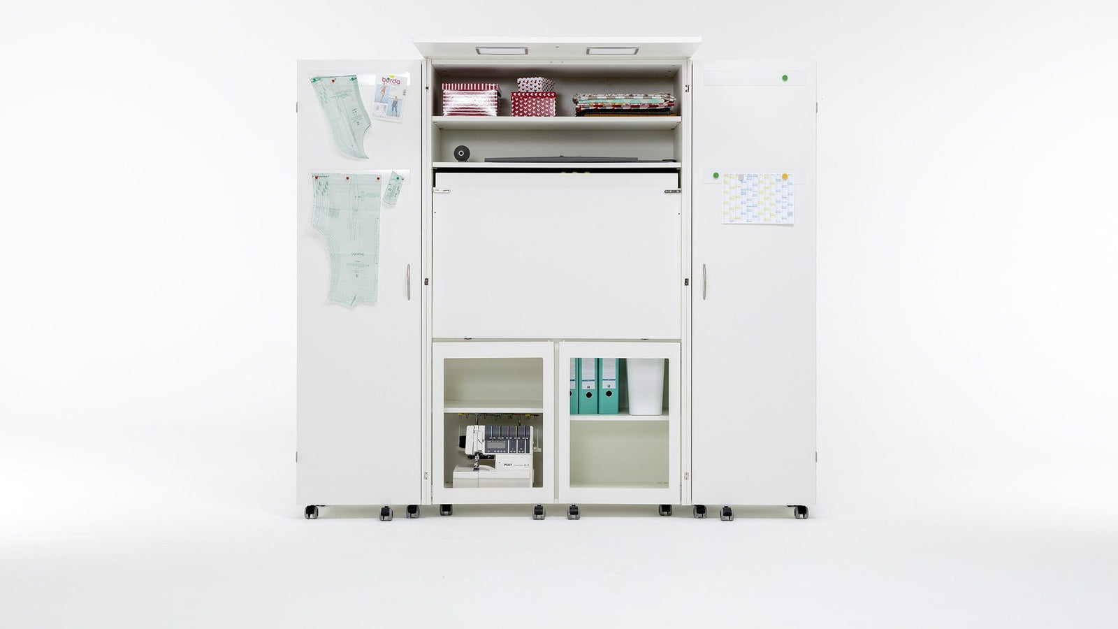 Die CUBO-Serie mit dem WOW–Effekt, hier in seiner Königsklasse als CUBO sew-master. Das Herzstück ist unser ausziehbarer DUO-Nähplatz in einer Breite von 1040mm, mit dem integriertem RMF-patentierten elektronische simply-5 Liftsystem. Das eingelassene i-Touch Bedienfeld mit Lock-, und zwei Memoryfunktionen runden die Bedienung ab. Die beiden fest eingebauten 4-Fach-Steckerleisten mit Rückseitiger Kabeldurchführung bietet Ihnen alle nötigen Stromanschlüsse im Möbel.