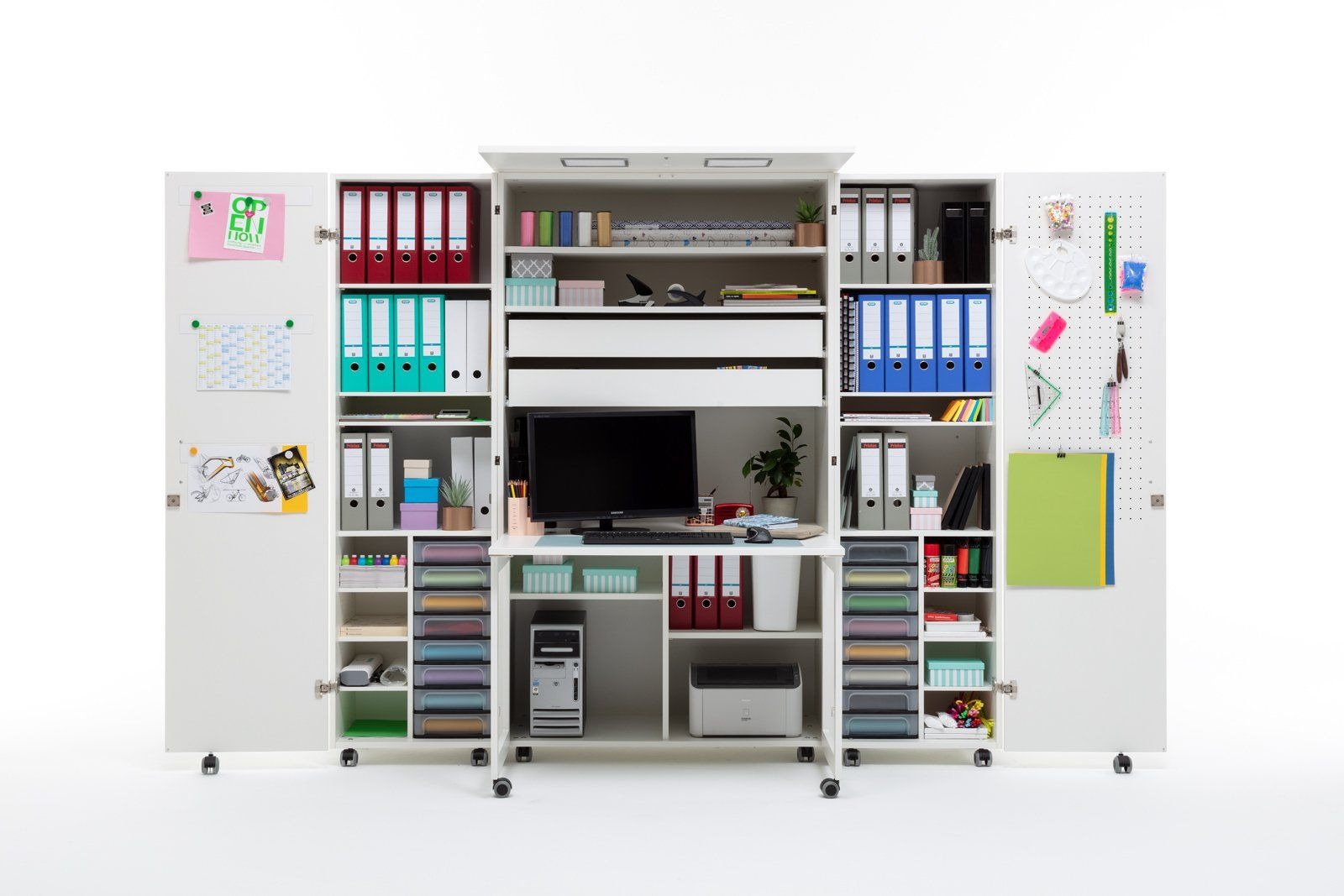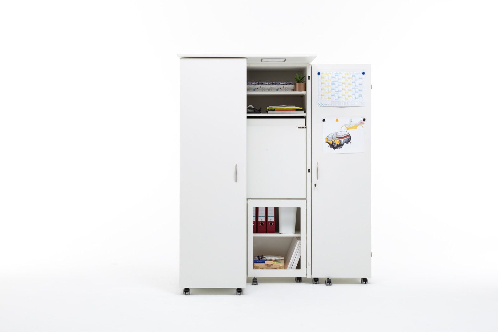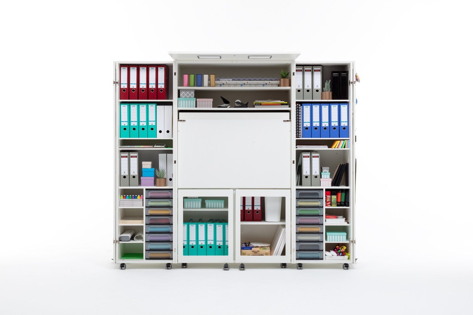 Die CUBO-Serie mit dem WOW–Effekt, hier als flexibeler CUBO work. Die große klappbare und fixierbare Arbeitsfläche bietet Ihnen genügend Platz zum Arbeiten im Homeoffice und zum Basteln, Zuschneiden, Hobby bleibt auch noch Stauraum. Die hinten links eingebaute 4-Fach-Steckerleisten mit rückseitiger Kabeldurchführung bietet Ihnen alle nötigen Stromanschlüsse, wie PC, Bildschirm, und vielem mehr im Möbel.
