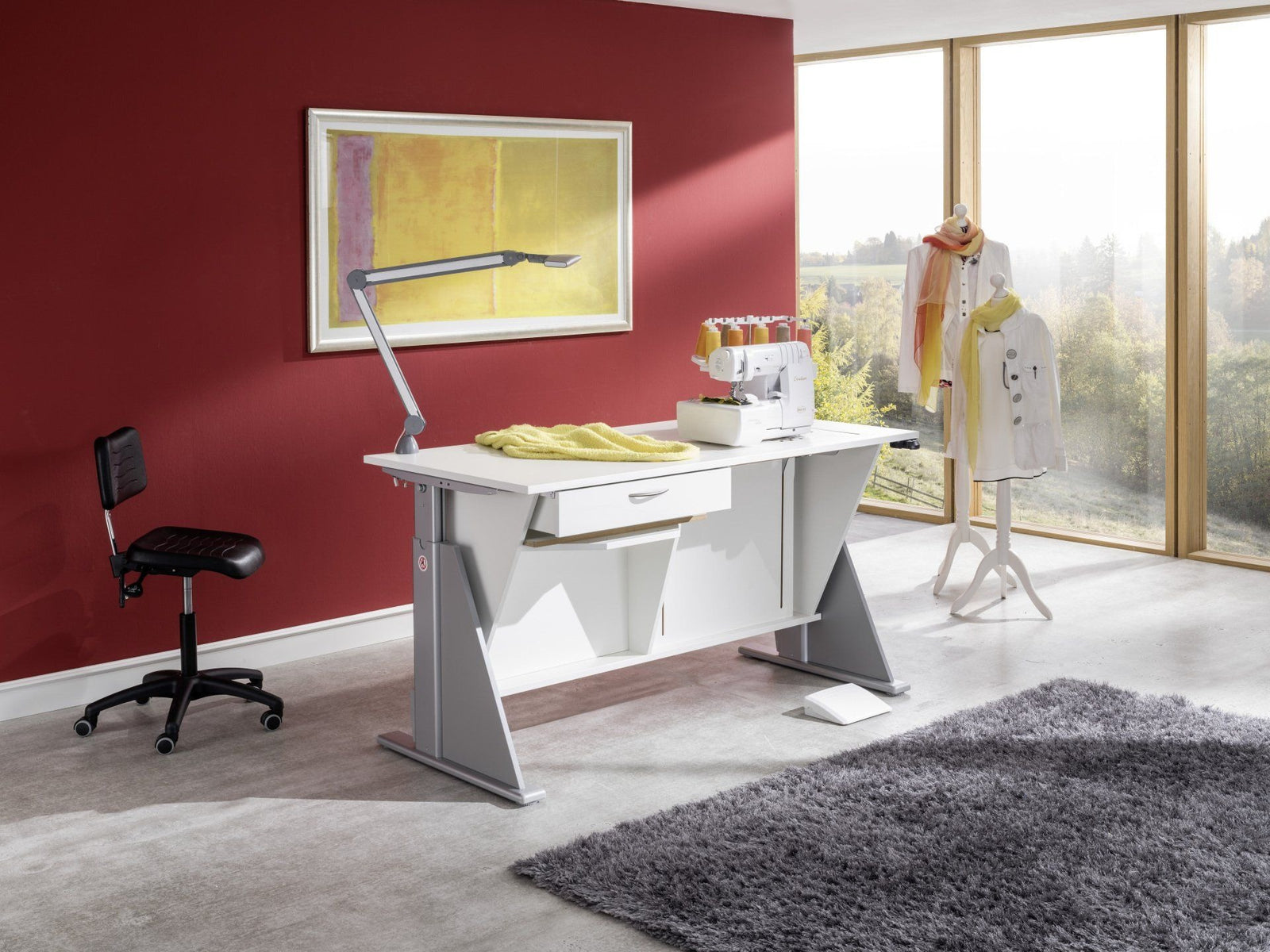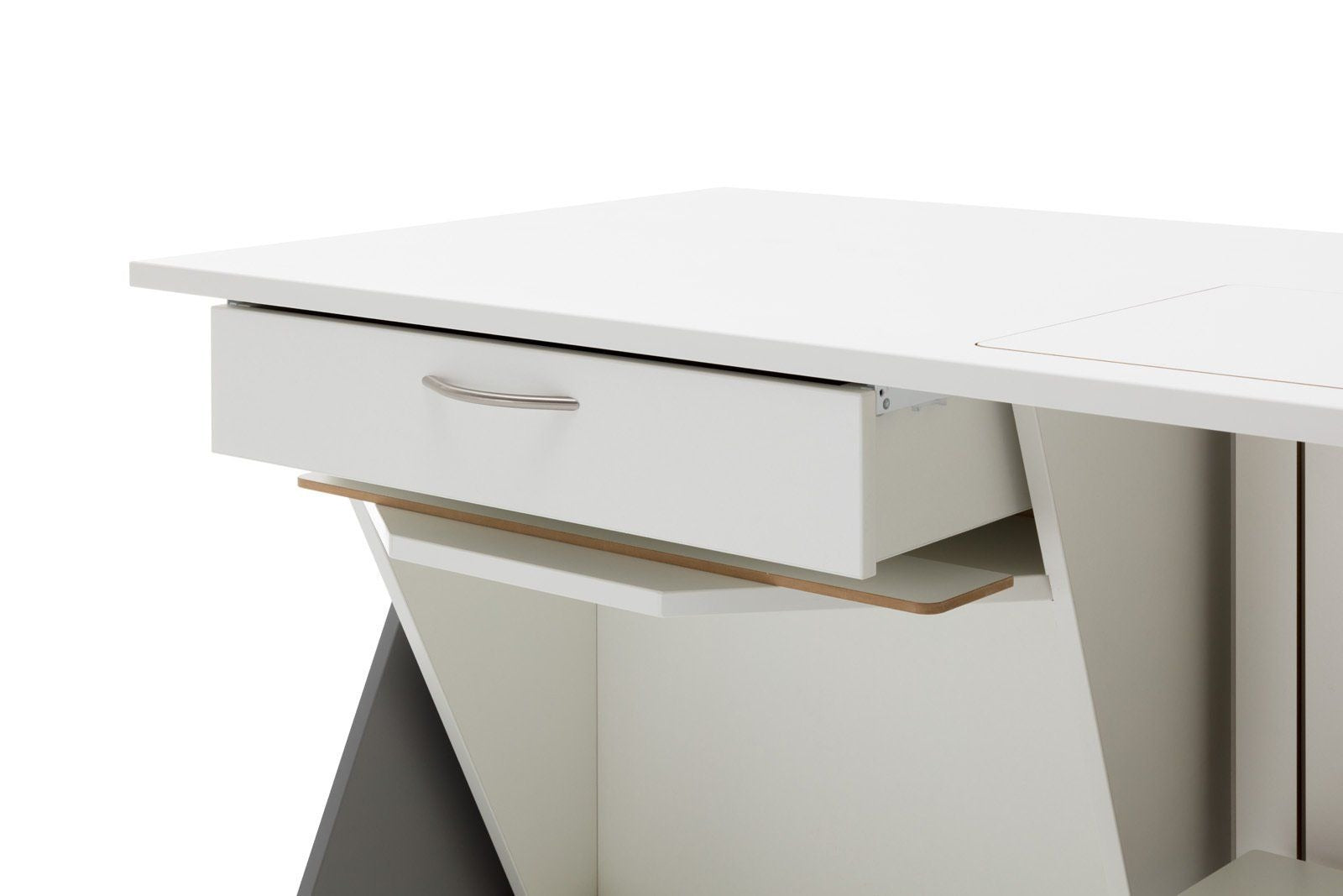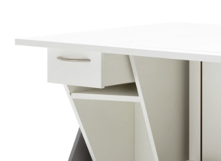 Unter der linken Tischfläche kann eine Schublade mit Griff und Teilauszug für die nötigen Nähutensilien eingebaut werden.