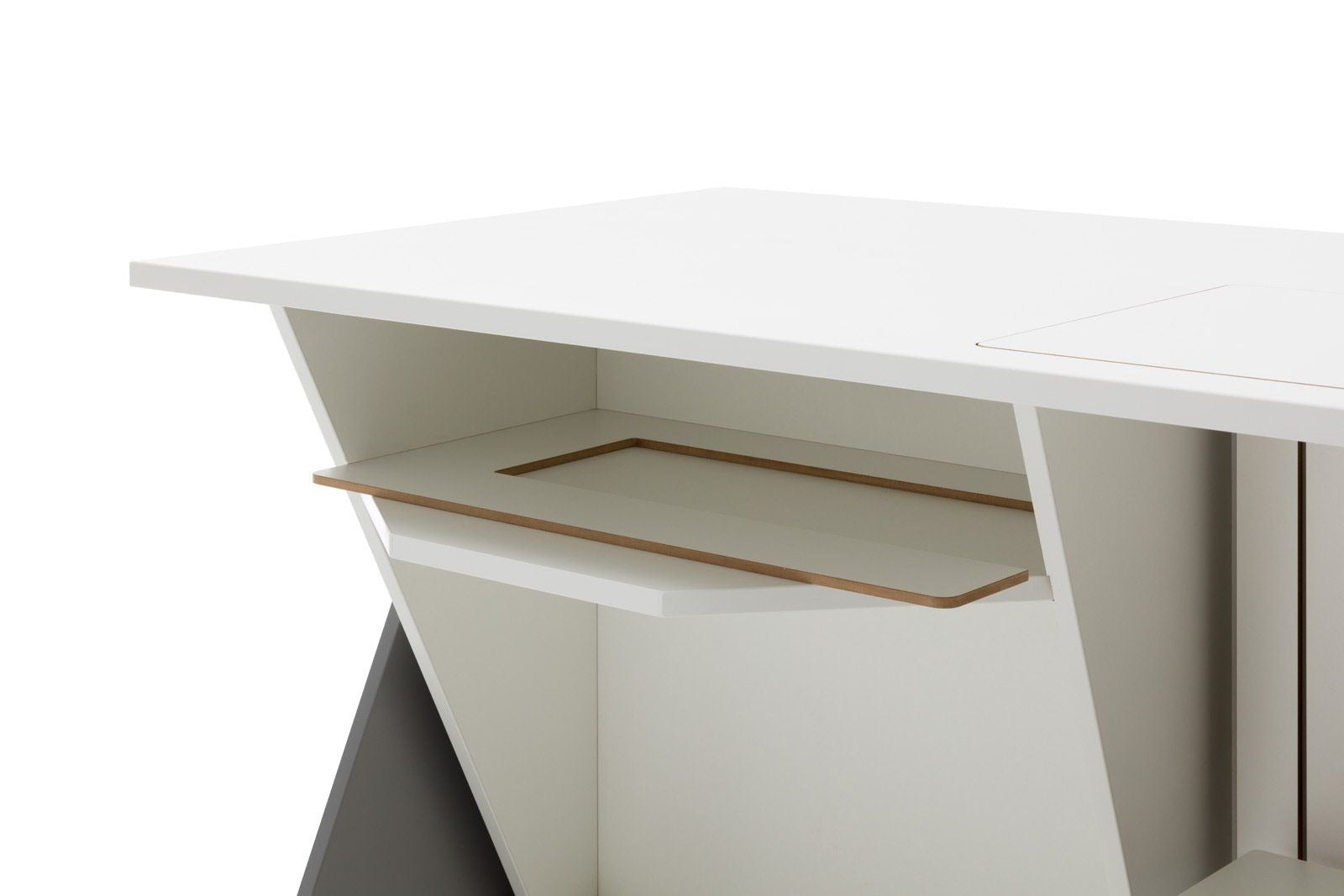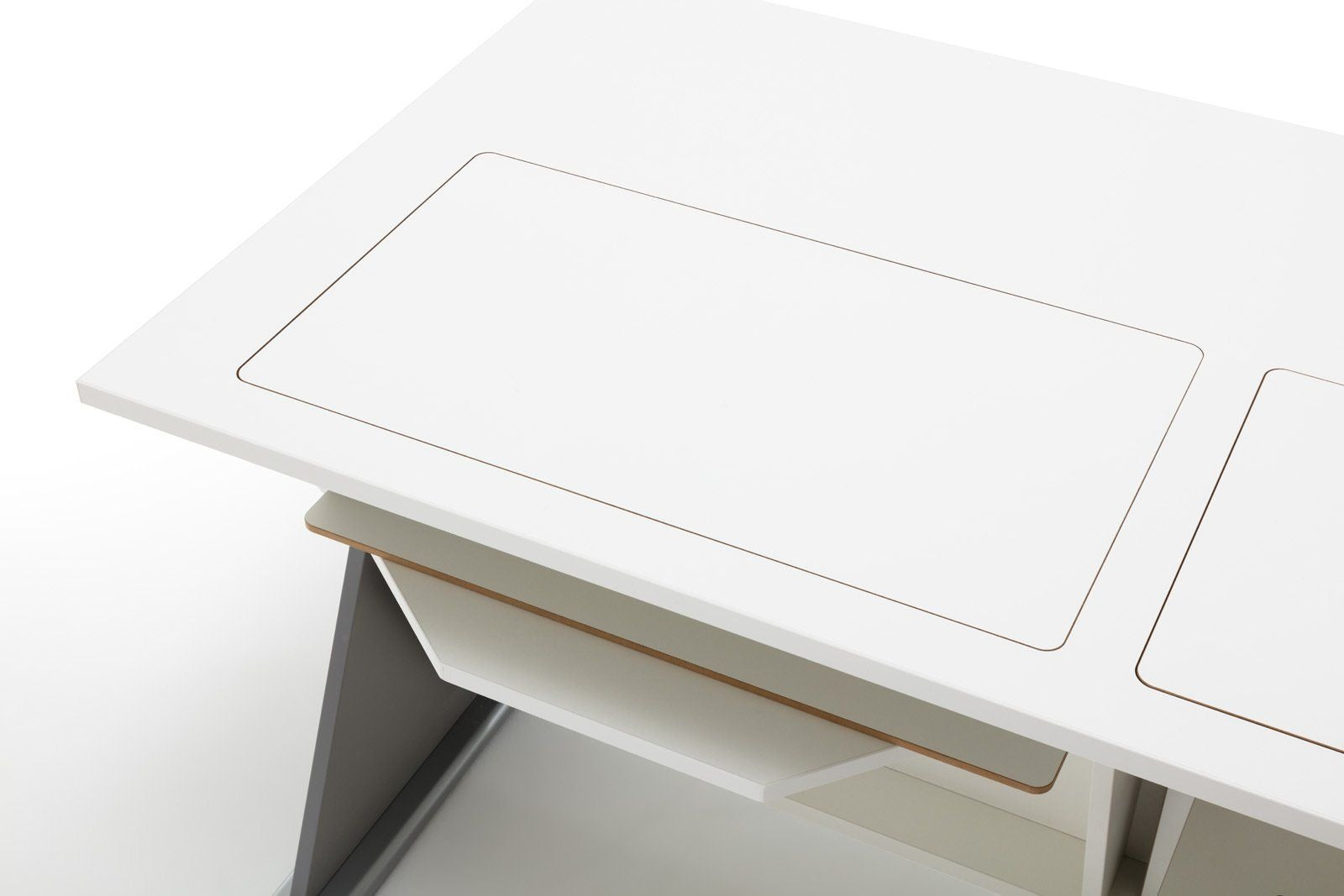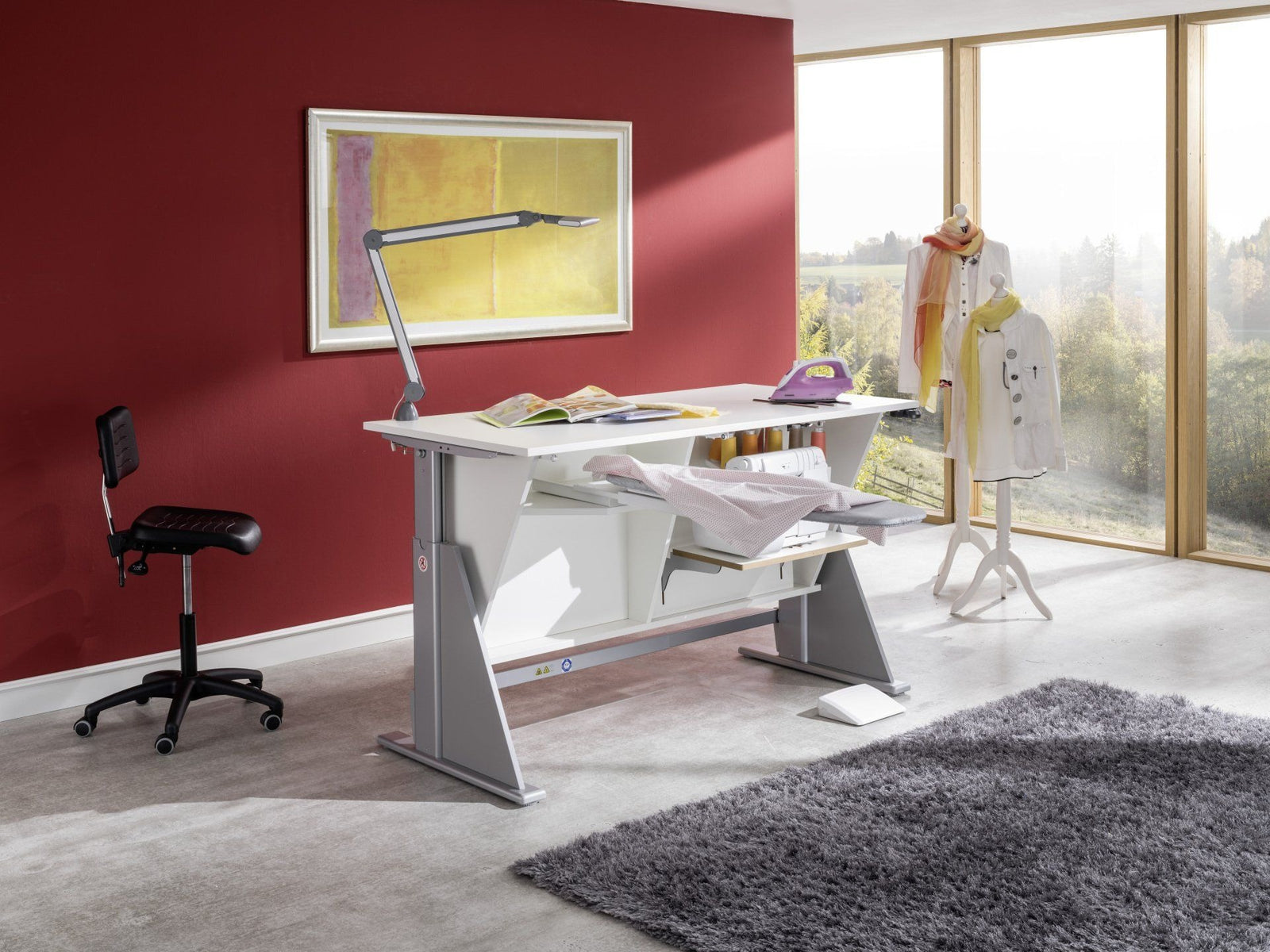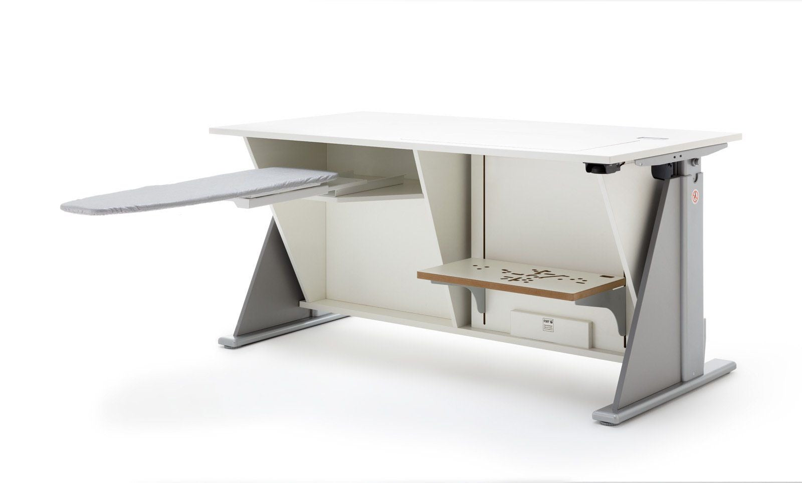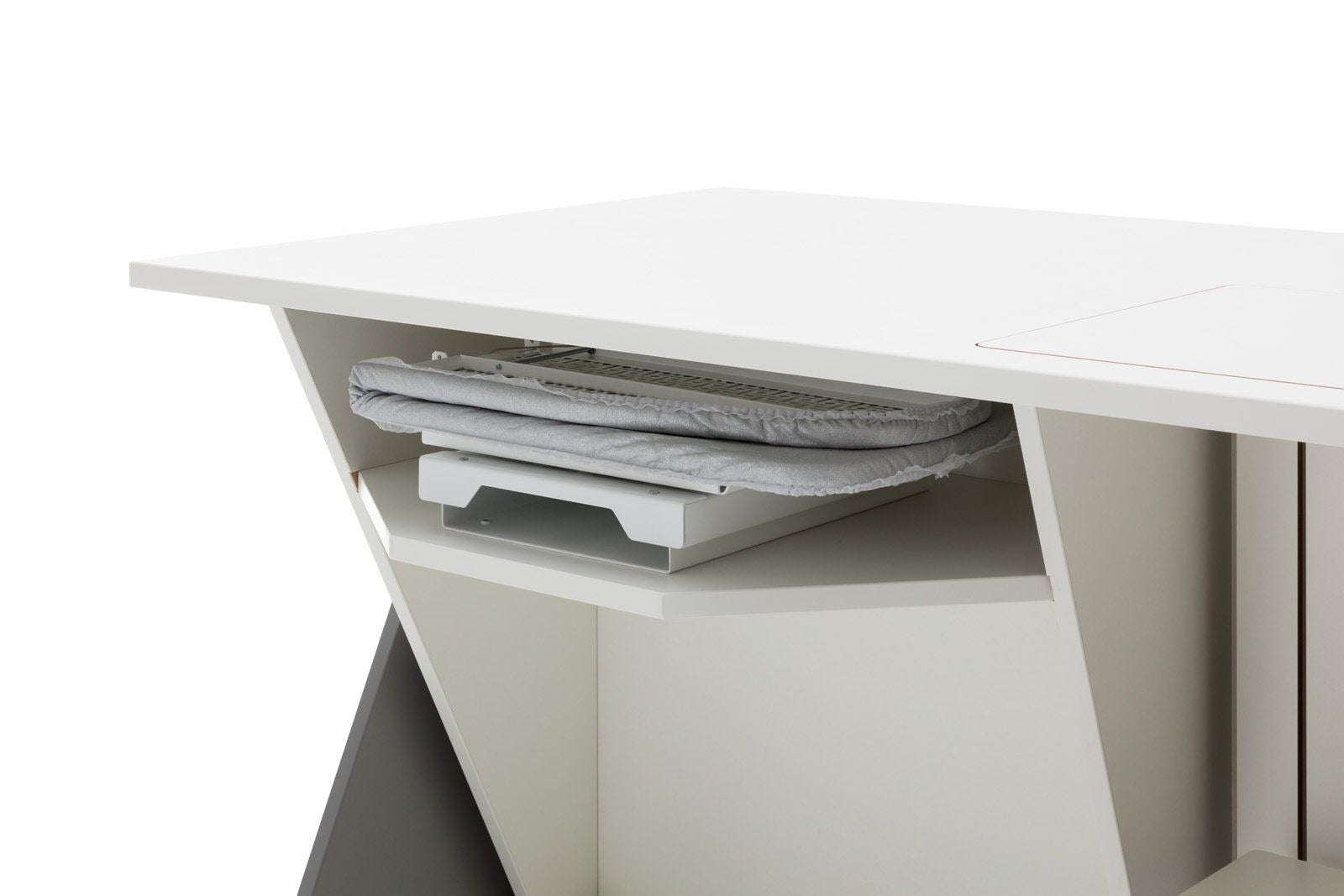 Anstatt einer Schublade kann man unter der linken Tischfläche auch ein voll ausziehbares und schwenkbares Bügelbrett mit Bügeleisenablage integrieren.