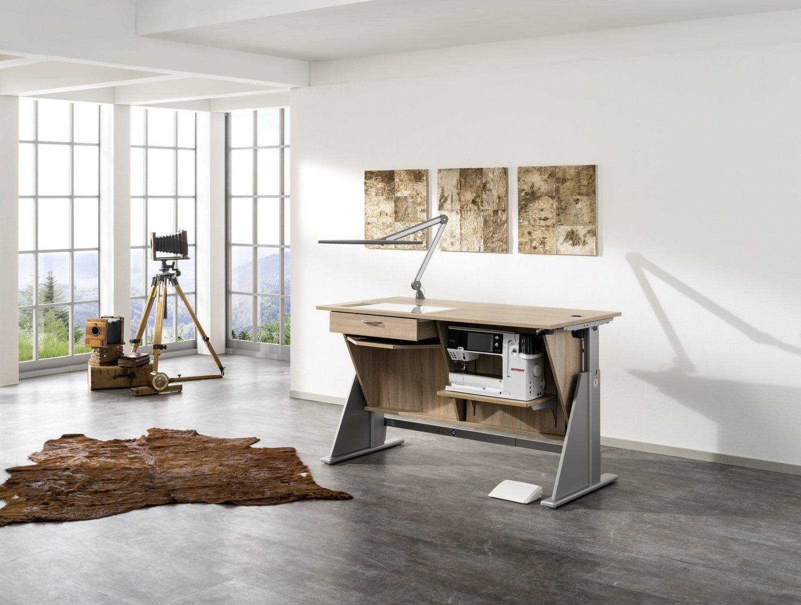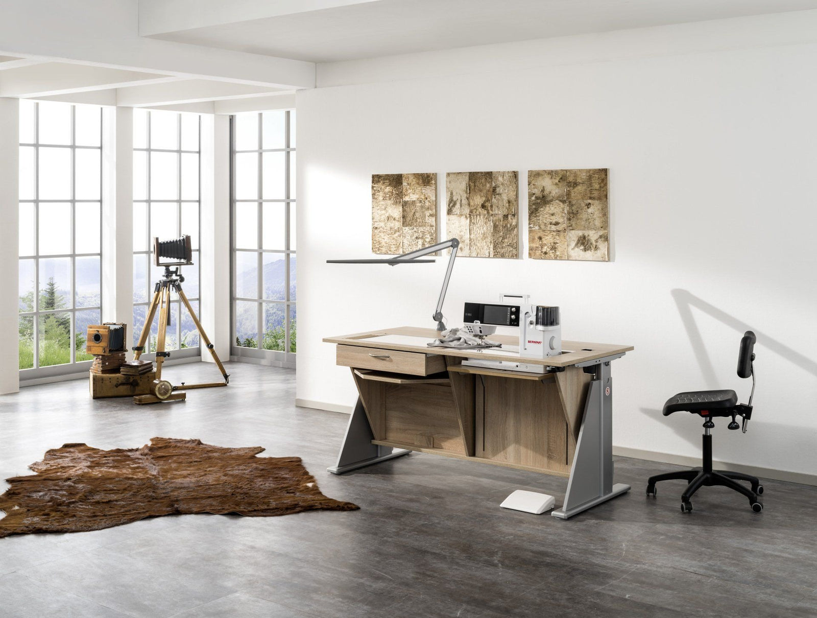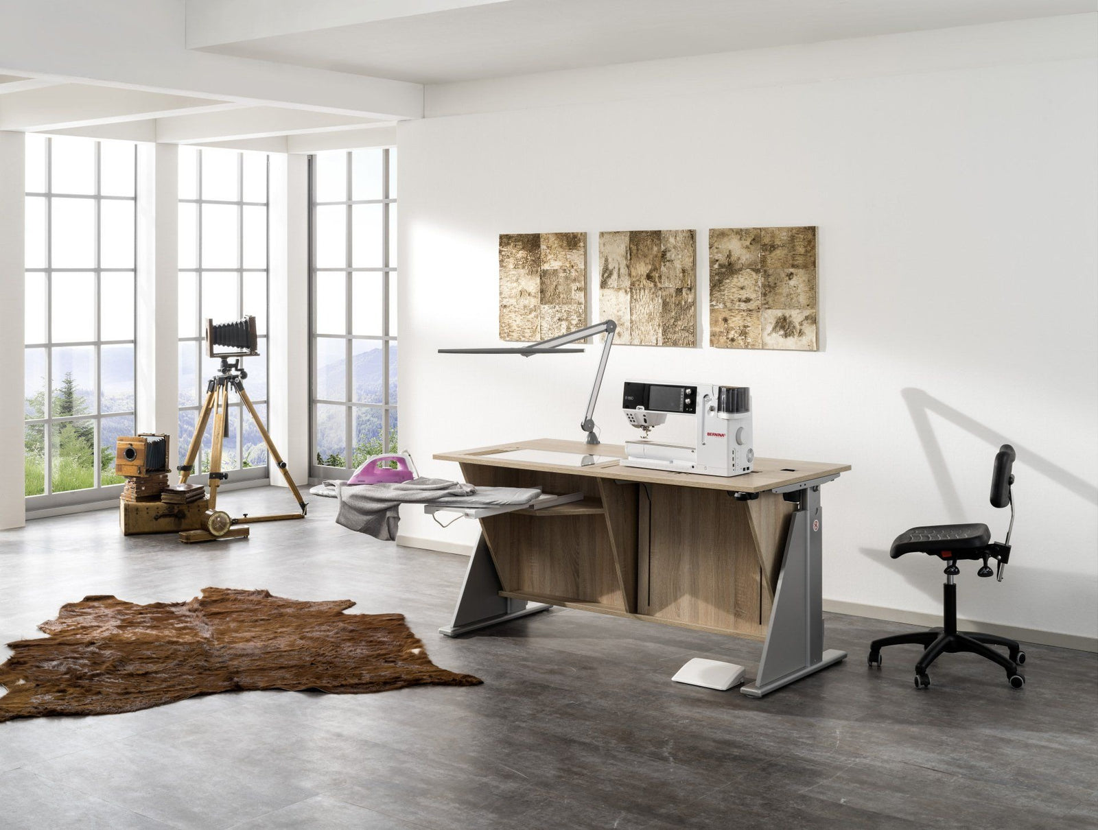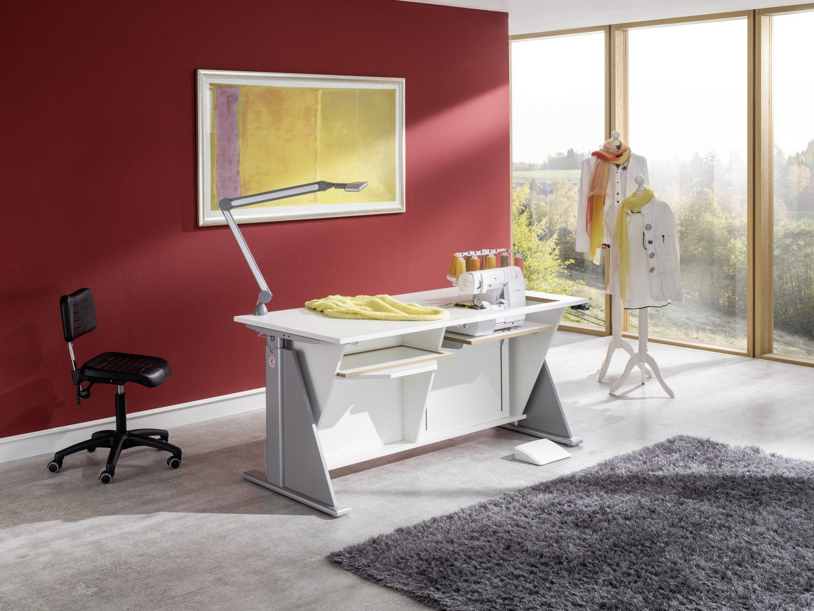 Das ultimative stufenlos höhenverstellbare Möbel in 160cm Länge für ergonomisches Arbeiten. Er passt sich jeder Körpergröße an. Egal ob Sie im Sitzen oder Stehen Zuschneiden, Nähen, Sticken möchten. Das Hobby macht wieder Spaß, denn Rücken-, und Nackenverspannung gehören nun der Vergangenheit an. Der eingebaute elektronisch gesteuerte RMF – easy-Softtech Lift bewegt jedes Maschinengewicht mühelos. Das in der Platte eingelassene i-Touch Bedienfeld mit Lock-, zwei Momoryfunktionen , und einer Auf und Ab Funktion runden die Bedienung ab. Durch den einheitlichen RMF – Simply-5 Ausschnitt ist der Nähtisch für alle Maschinentypen, egal ob Nähmaschine, Overlockmaschine oder Coverlockmaschine geeignet.