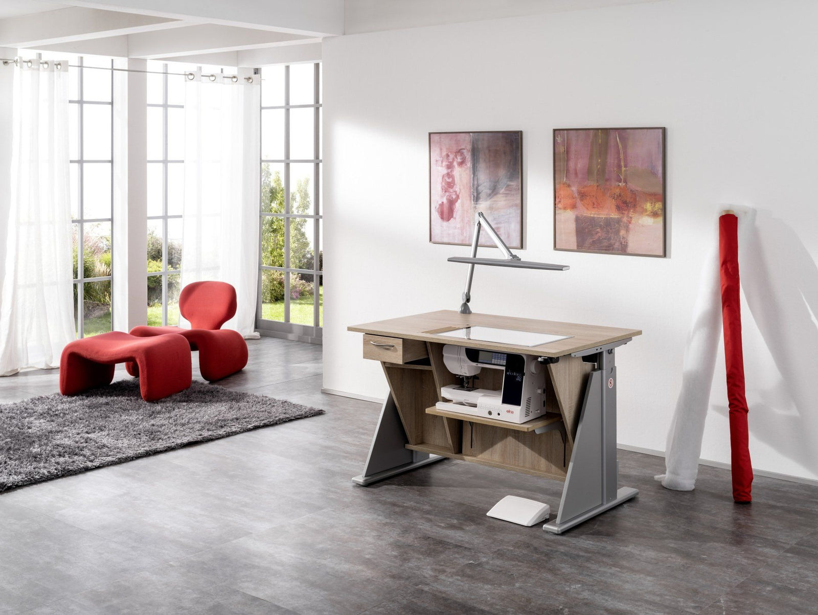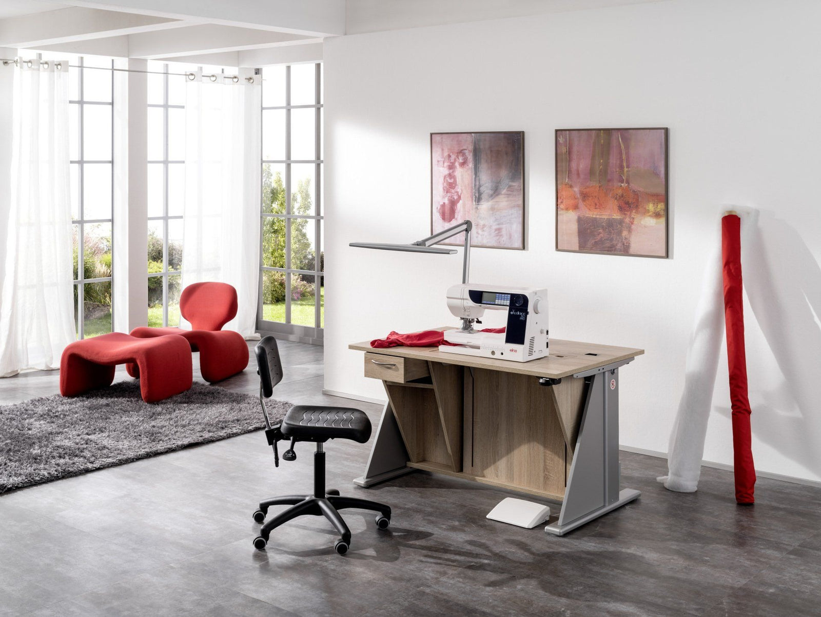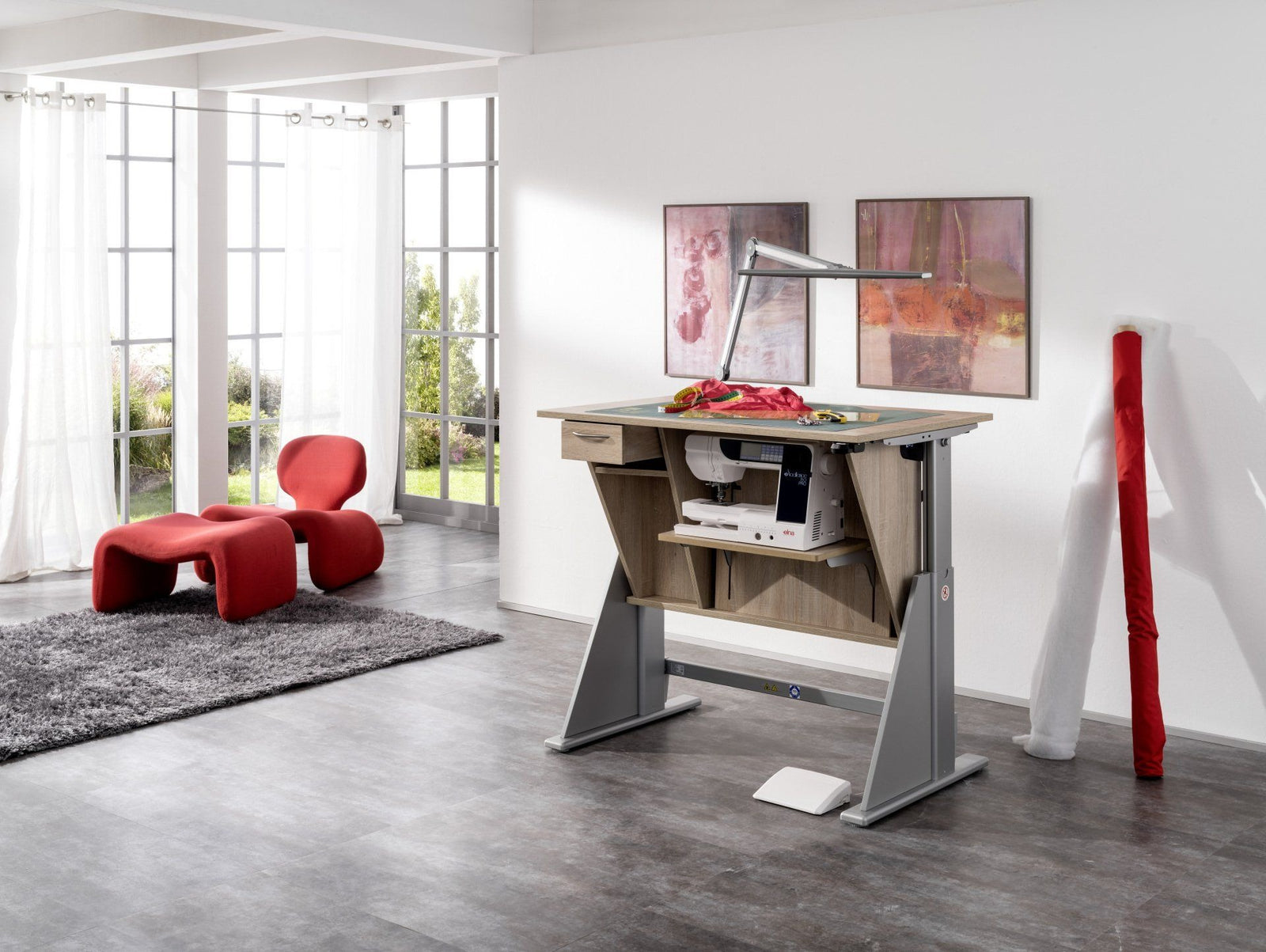 Das ultimative stufenlos höhenverstellbare Möbel in 120cm Länge für ergonomisches Arbeiten. Er passt sich jeder Körpergröße an. Egal ob Sie im Sitzen oder Stehen Zuschneiden, Nähen, Sticken möchten. Das Hobby macht wieder Spaß, denn Rücken-, und Nackenverspannung gehören nun der Vergangenheit an. Der eingebaute elektronisch gesteuerte RMF – easy-Softtech Lift bewegt jedes Maschinengewicht mühelos. Das in der Platte eingelassene i-Touch Bedienfeld mit Lock-, zwei Momoryfunktionen, und einer Auf und Ab Funktion runden die Bedienung ab. Durch den einheitlichen RMF – Simply-5 Ausschnitt ist der Nähtisch für alle Maschinentypen, egal ob Nähmaschine, Overlockmaschine oder Coverlockmaschine geeignet.