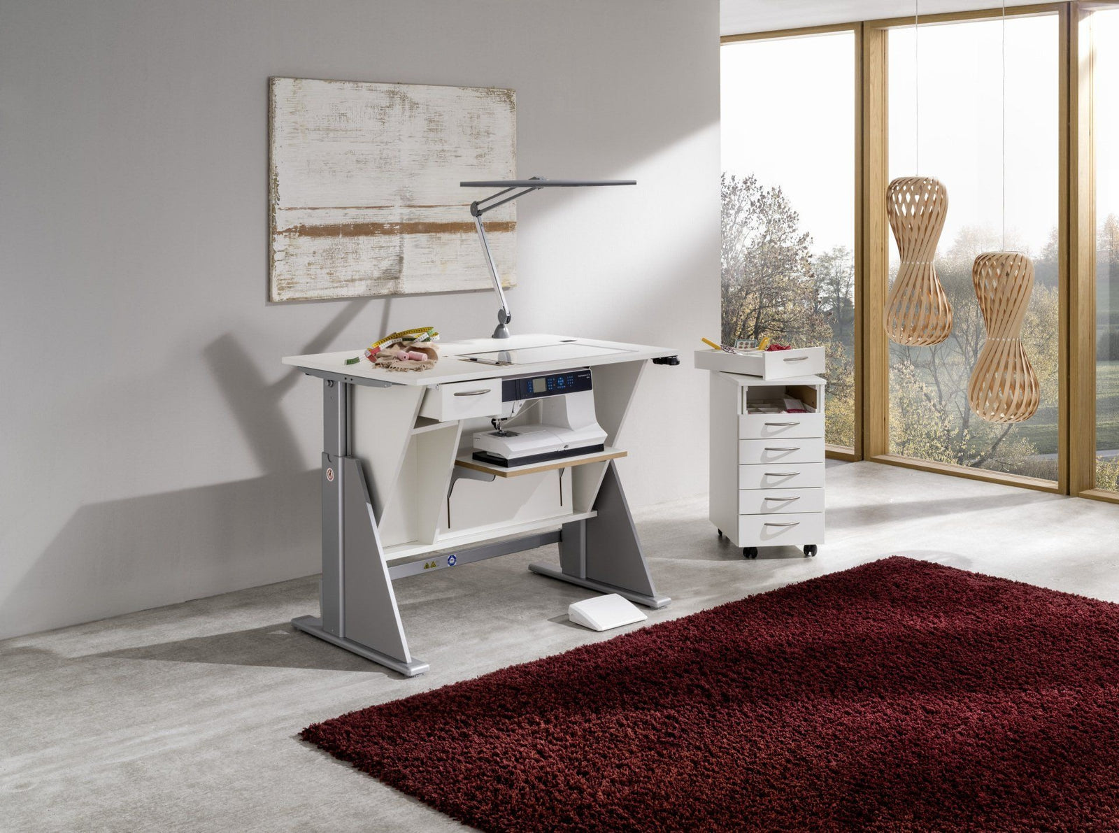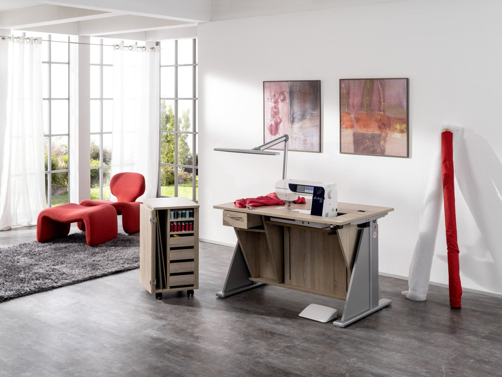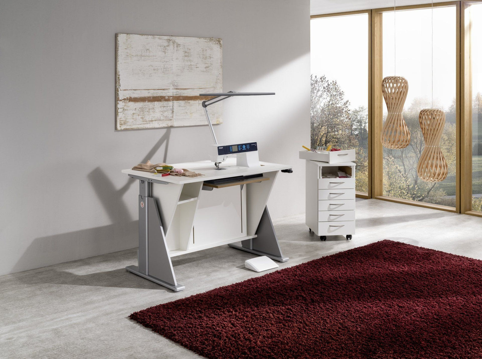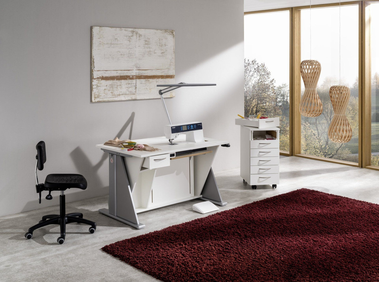 Das ultimative stufenlos höhenverstellbare Möbel in 120cm Länge für ergonomisches Arbeiten. Er passt sich jeder Körpergröße an. Egal ob Sie im Sitzen oder Stehen Zuschneiden, Nähen, Sticken möchten. Das Hobby macht wieder Spaß, denn Rücken-, und Nackenverspannung gehören nun der Vergangenheit an. Der eingebaute elektronisch gesteuerte RMF – easy-Softtech Lift bewegt jedes Maschinengewicht mühelos. Das in der Platte eingelassene i-Touch Bedienfeld mit Lock-, zwei Momoryfunktionen, und einer Auf und Ab Funktion runden die Bedienung ab. Durch den einheitlichen RMF – Simply-5 Ausschnitt ist der Nähtisch für alle Maschinentypen, egal ob Nähmaschine, Overlockmaschine oder Coverlockmaschine geeignet.