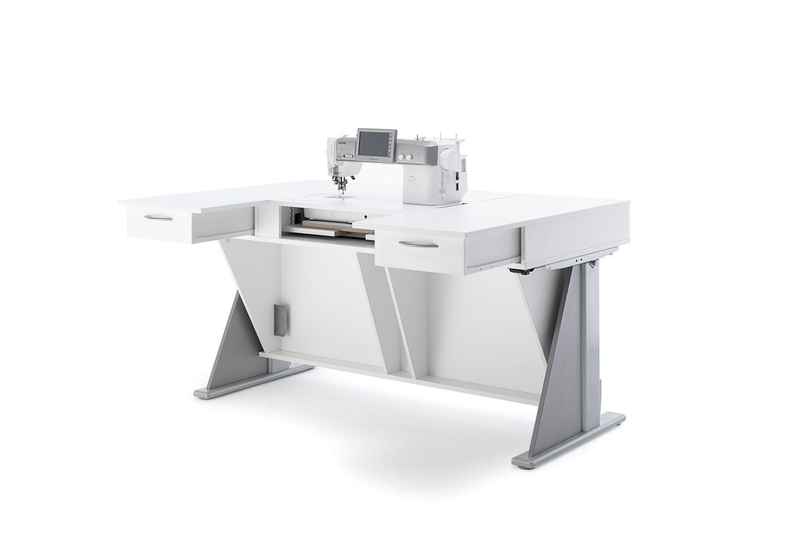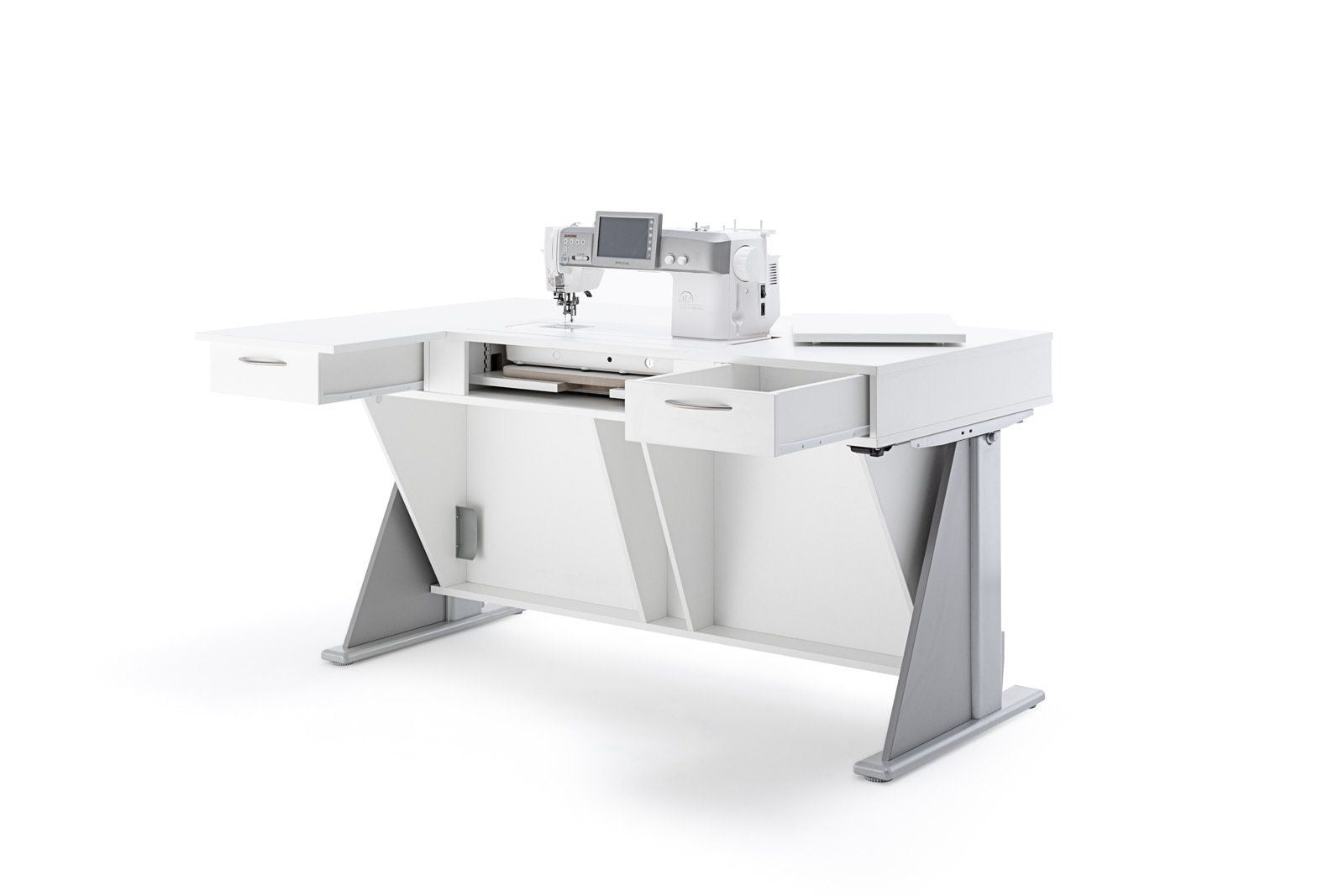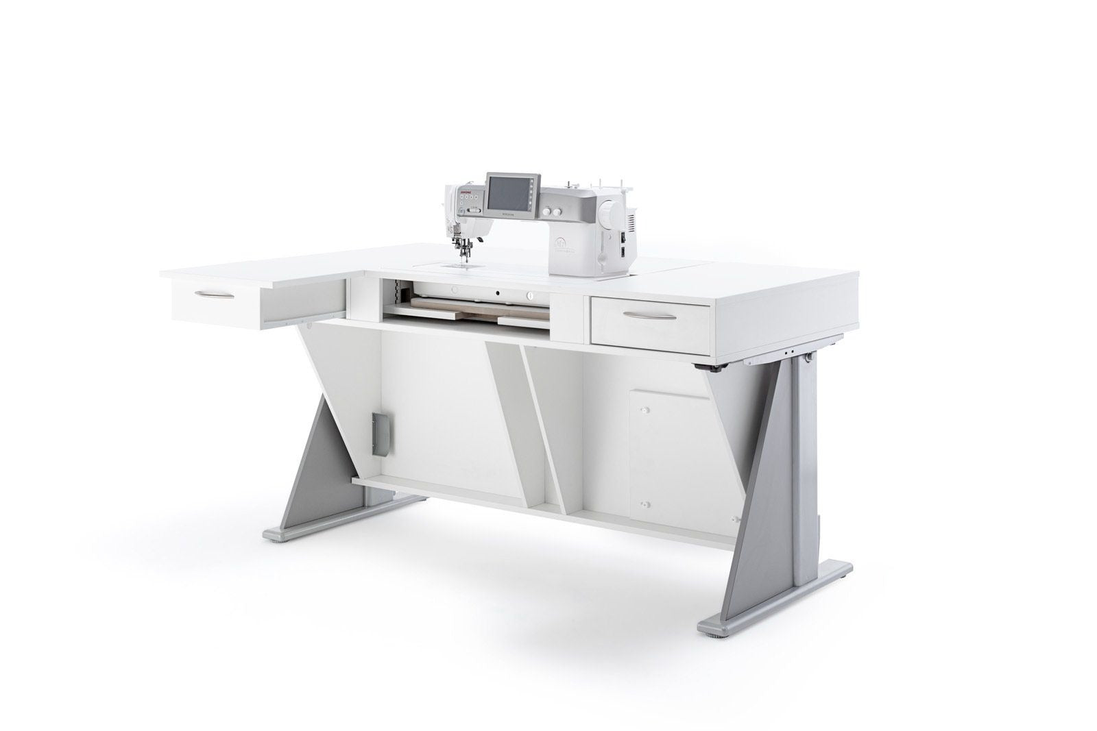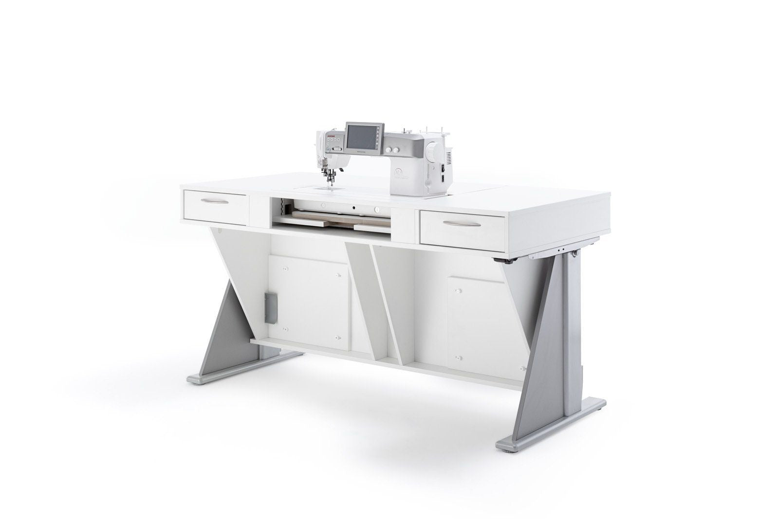 BERNINA LONGARM Q20 entwickelt. Er ist in der Höhe verstellbar und wurde mit den unterschiedlichsten Optionen ausgestatte, um ein angenehmes und ergonomisches Quilten in jeder Höhenposition zu ermöglichen. Das Design vom QUILT TABLE ist an unser bestehendes CREATIVE-HOBBY-ROOMS Möbelprogramm angelehnt. Er bietet funktional eine Vielzahl von Kombinationsmöglichkeiten mit unseren unterschiedlichsten Möbeln und Dekorvarianten.