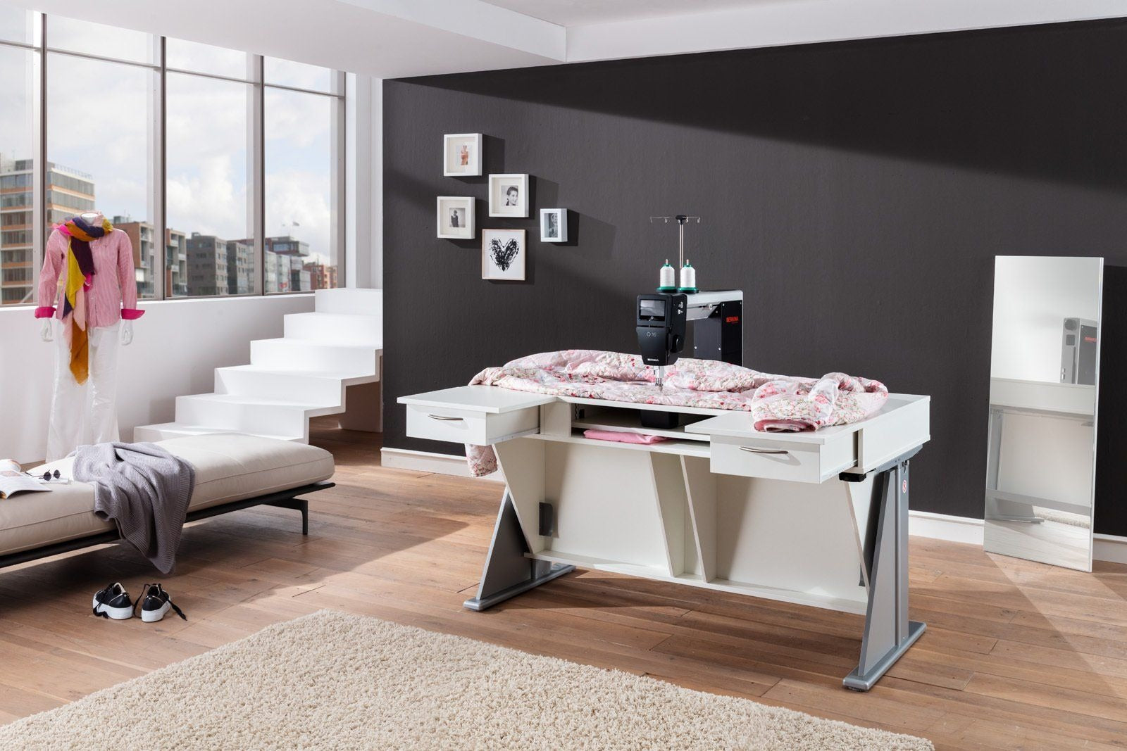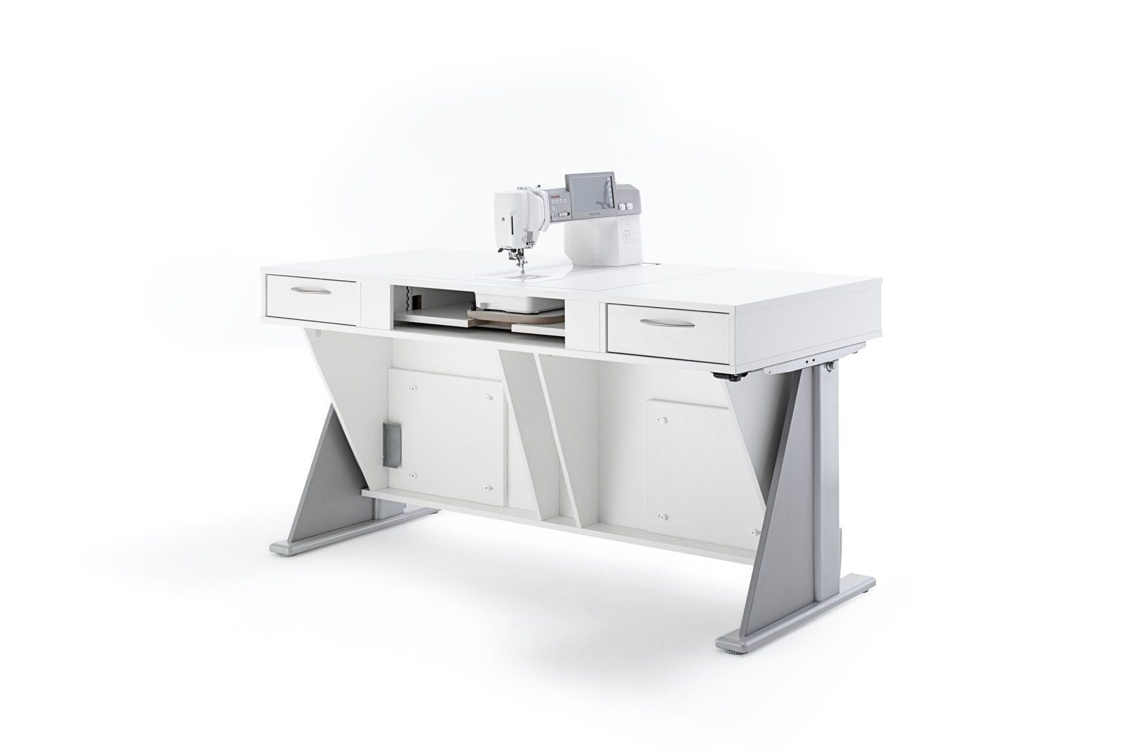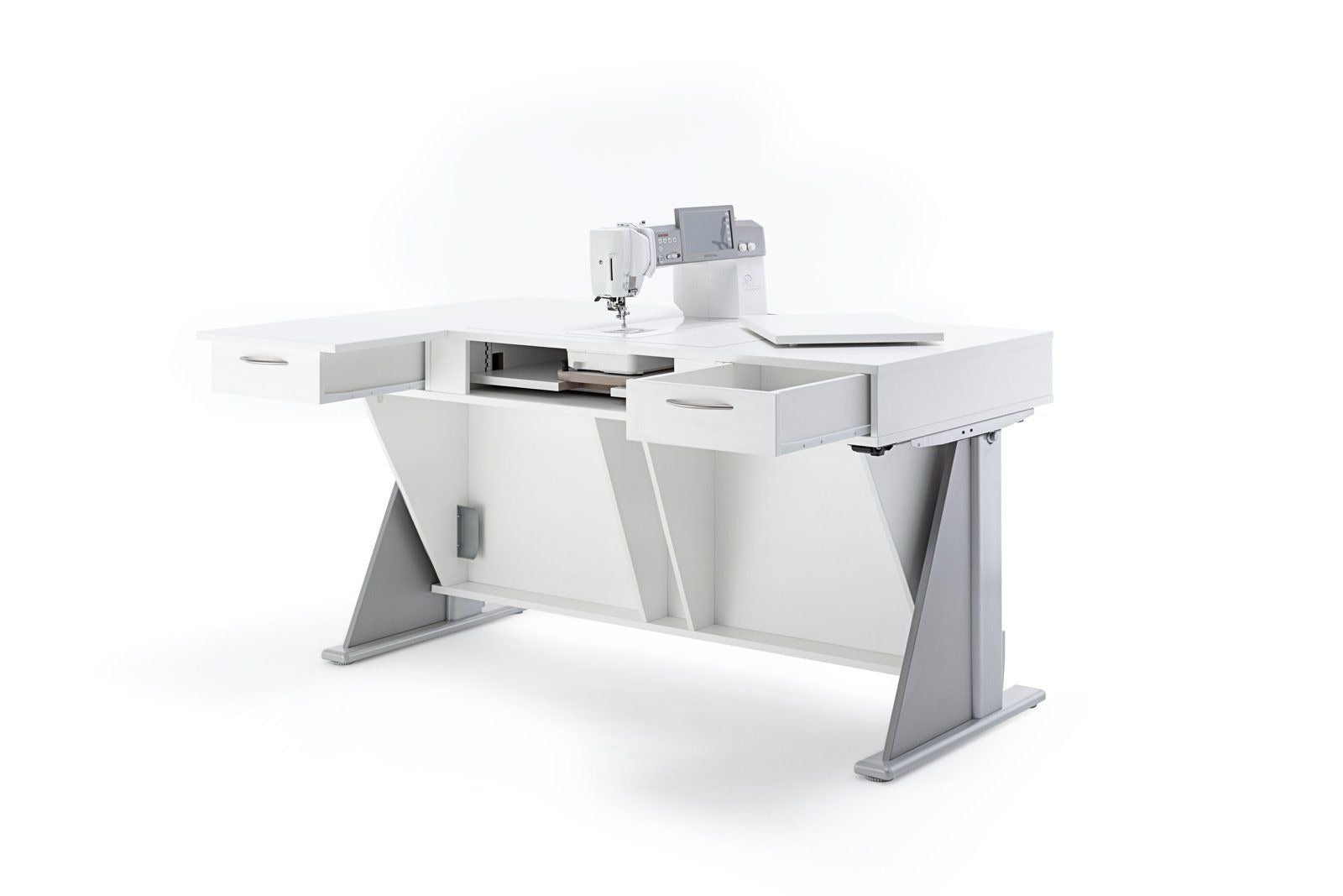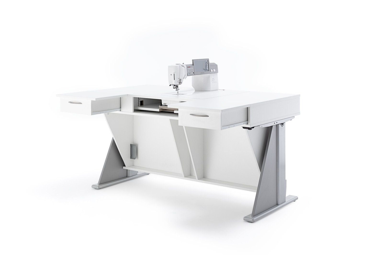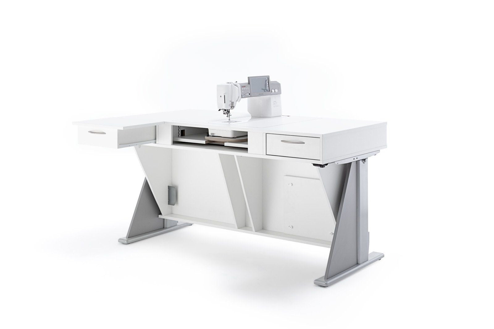 BERNINA LONGARM Q20 entwickelt. Er ist in der Höhe verstellbar und wurde mit den unterschiedlichsten Optionen ausgestatte, um ein angenehmes und ergonomisches Quilten in jeder Höhenposition zu ermöglichen. Das Design vom QUILT TABLE ist an unser bestehendes CREATIVE-HOBBY-ROOMS Möbelprogramm angelehnt. Er bietet funktional eine Vielzahl von Kombinationsmöglichkeiten mit unseren unterschiedlichsten Möbeln und Dekorvarianten.
