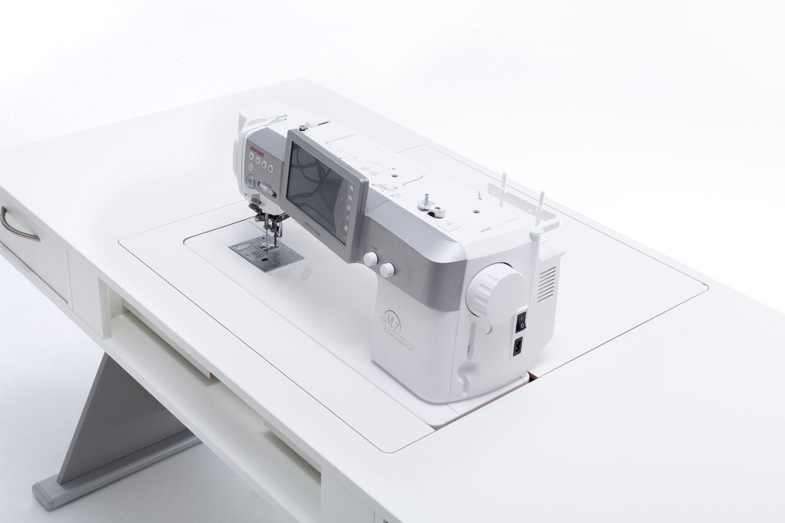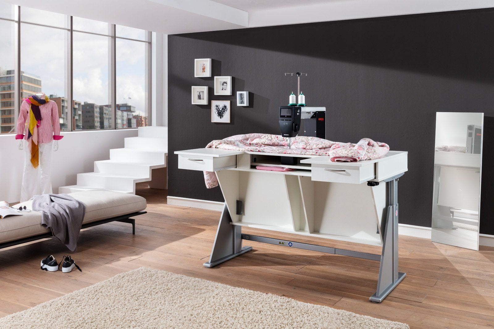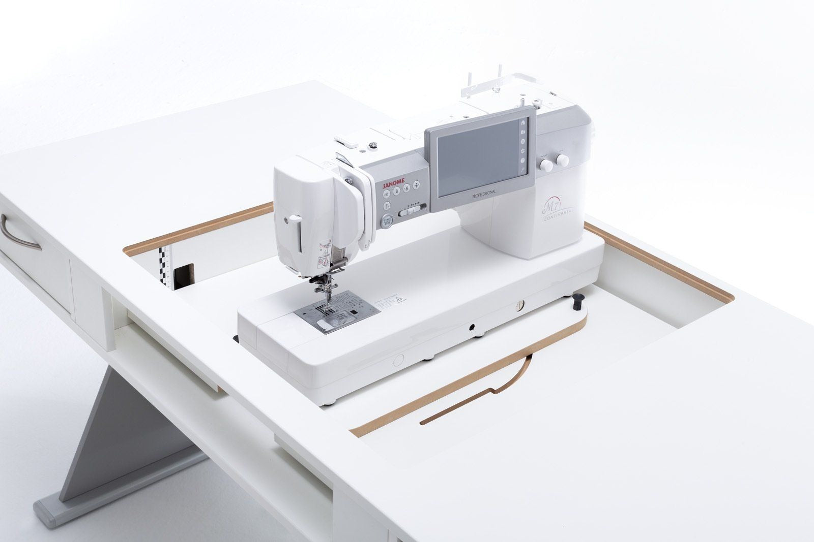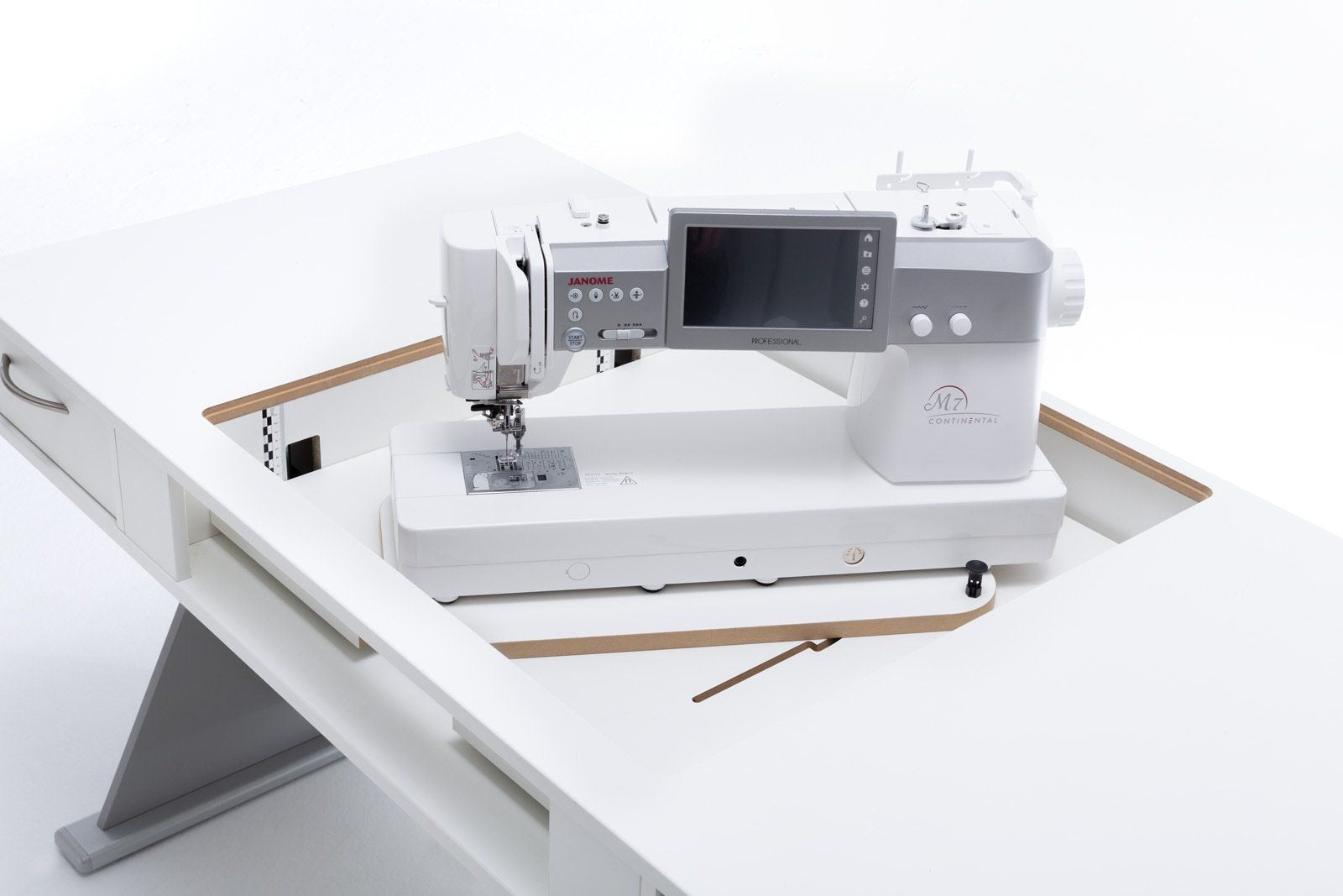BERNINA LONGARM Q20 entwickelt. Er ist in der Höhe verstellbar und wurde mit den unterschiedlichsten Optionen ausgestatte, um ein angenehmes und ergonomisches Quilten in jeder Höhenposition zu ermöglichen. Das Design vom QUILT TABLE ist an unser bestehendes CREATIVE-HOBBY-ROOMS Möbelprogramm angelehnt. Er bietet funktional eine Vielzahl von Kombinationsmöglichkeiten mit unseren unterschiedlichsten Möbeln und Dekorvarianten.