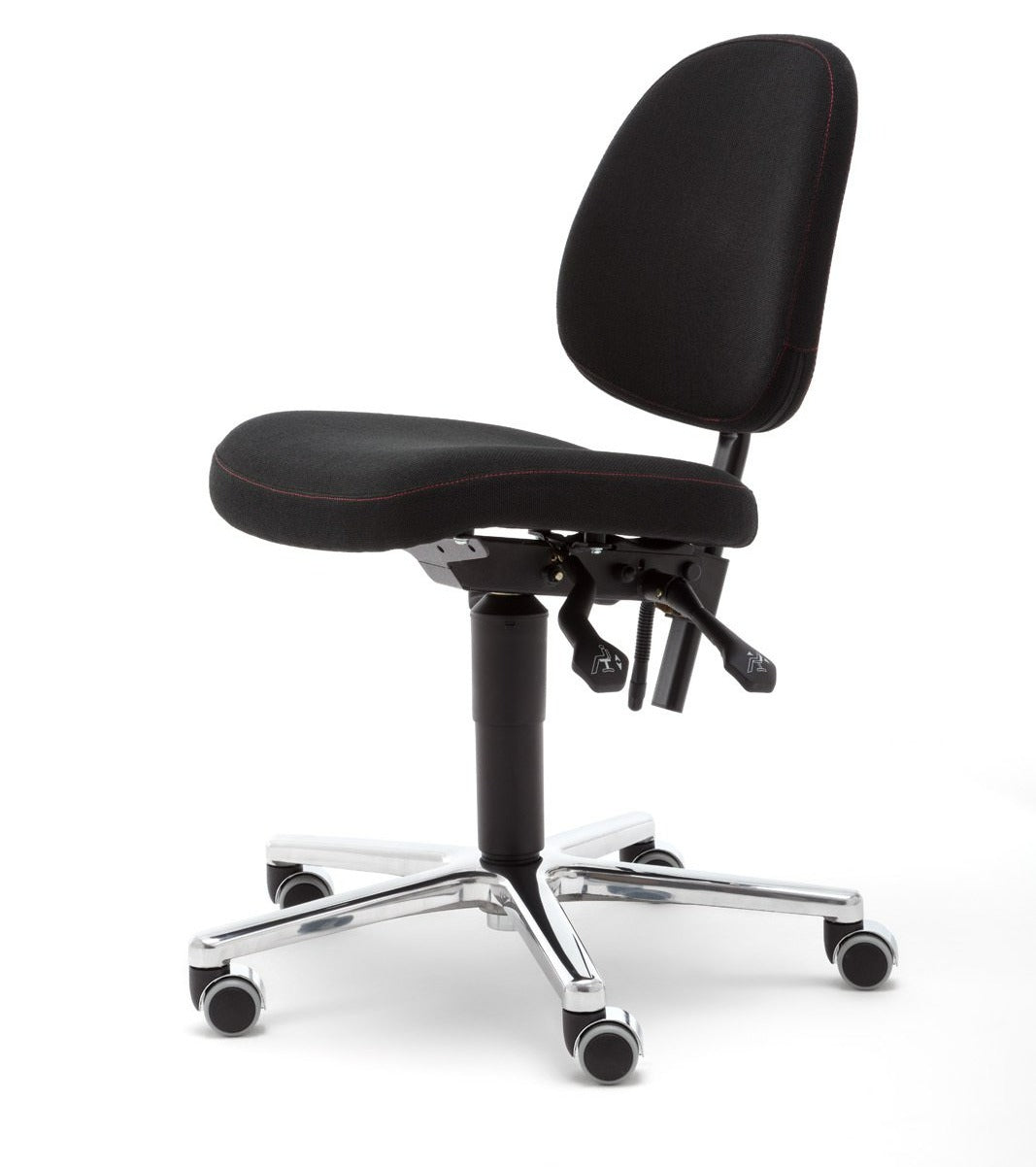 Unser stabiler, gepolsteter, und für alle Modelle geeigneter Drehstuhl CHAIR two, mit der Gasfeder-Höhenverstellung von 51 – 65 cm ist auch für unser höheren Möbelmodelle CRAFT und TWIN mit der erhöhten Arbeitsfläche die optimale Ergänzung. Eigentlich geht es ohne diesen ergonomischen Stuhl gar nicht. Unbedingt notwendig ist die geniale Sitzneigungsverstellung von +4° bis -8° welche die ergonomische Bedienung Ihres Nähmaschinenfußpedales erst möglich macht. Die pendelnd gelagerte Rückenneigung von +4° bis -18° und die pflegeleichte schwarz gepolsterte Sitz-, und Rückenlehne samt den lastabhängigen Rollen am sehr stabilen Aluminium Fußkreuz runden diesen Qualitätsstuhl ab.