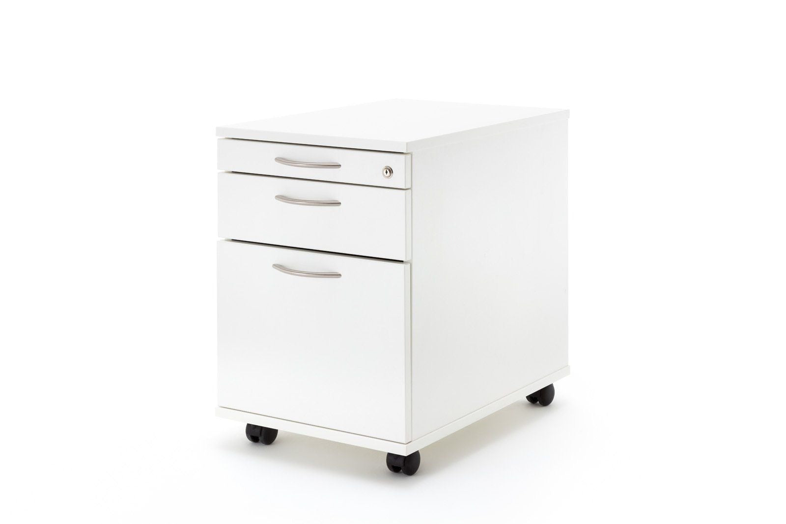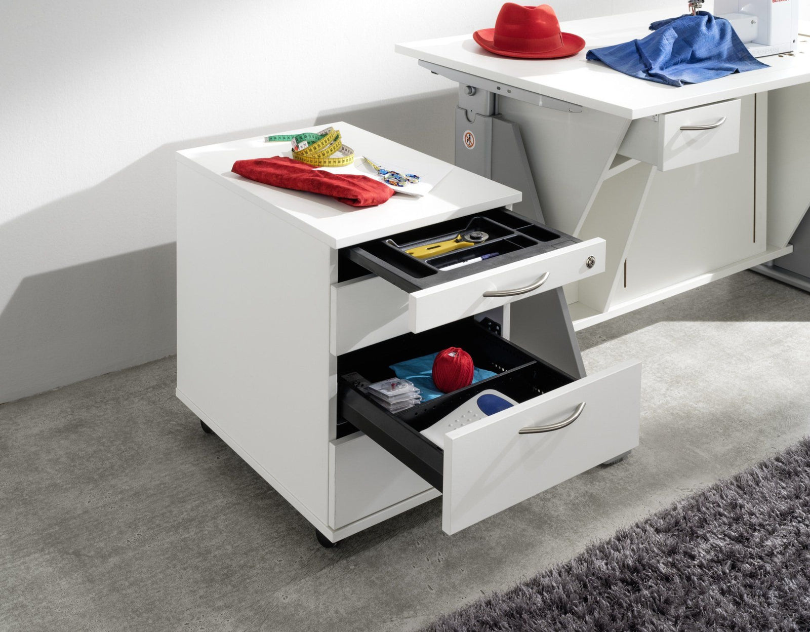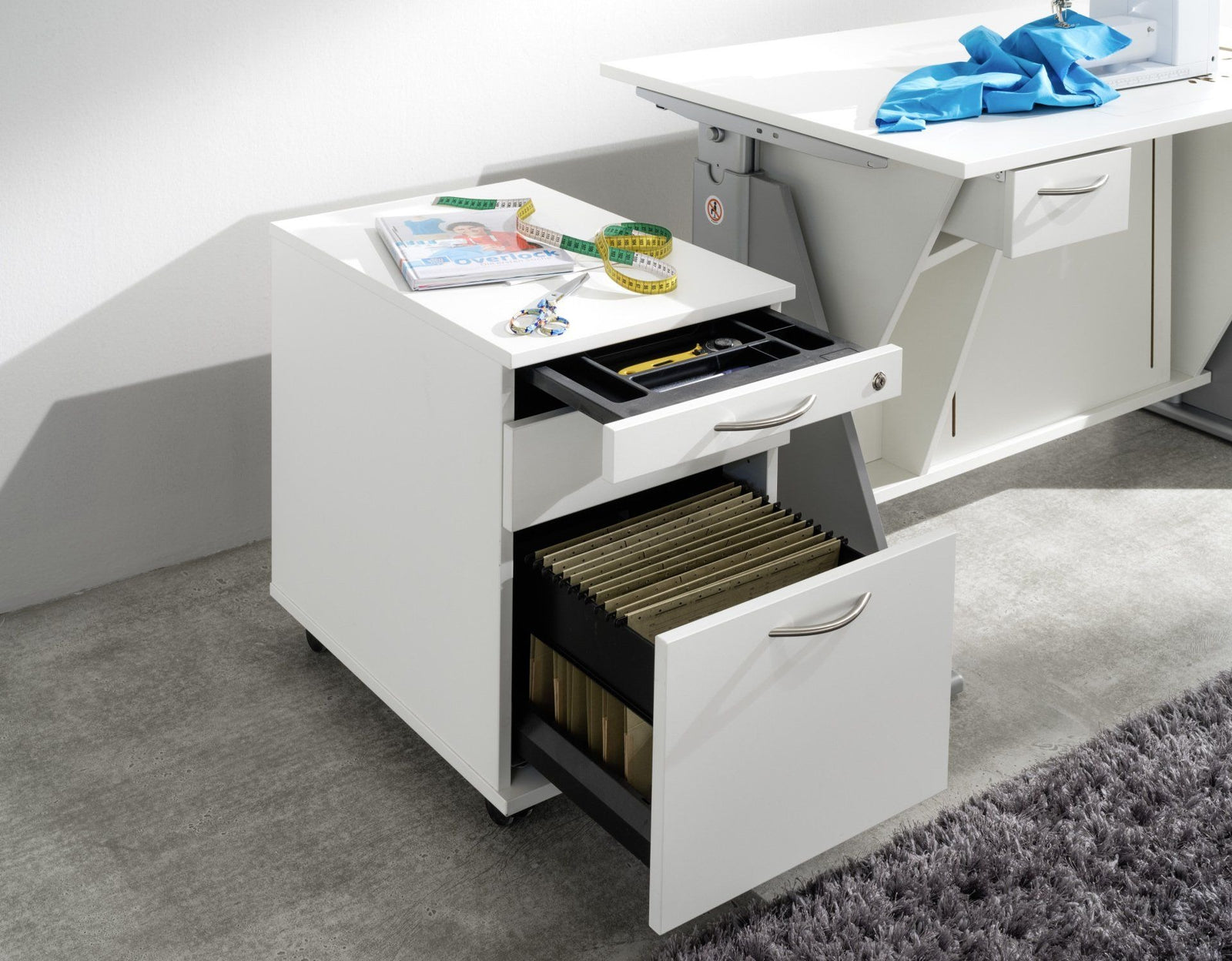 Obere Kleinteile Schreibmaterial-Auszug und Zentralverschluss, Metallschubkasten mit 1 Quereinteilung und Teilauszug, 1 Hängeregister A4 mit Teilauszug.