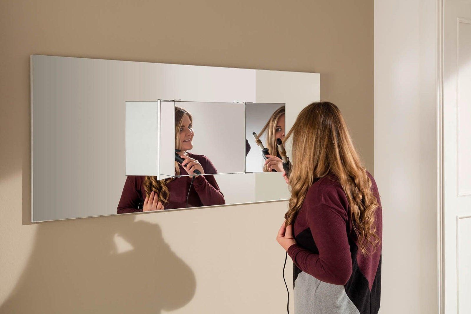 Durch die mit einem Spezialscharnier verbundenen beiden Seitenflügel ist eine Betrachtung der Frisur und des Kopfbereiches rundherum möglich. Mit den integrierten Saugnäpfen ist dieser einfach an jeder glatten Fläche durch ein leichtes befeuchten fast dauerhaft zu befestigen. Da dieser leichte Spiegel nicht aus Glas besteht kann dieser bei Flugreisen bequem und in Hotels bequem eingesetzt werden.