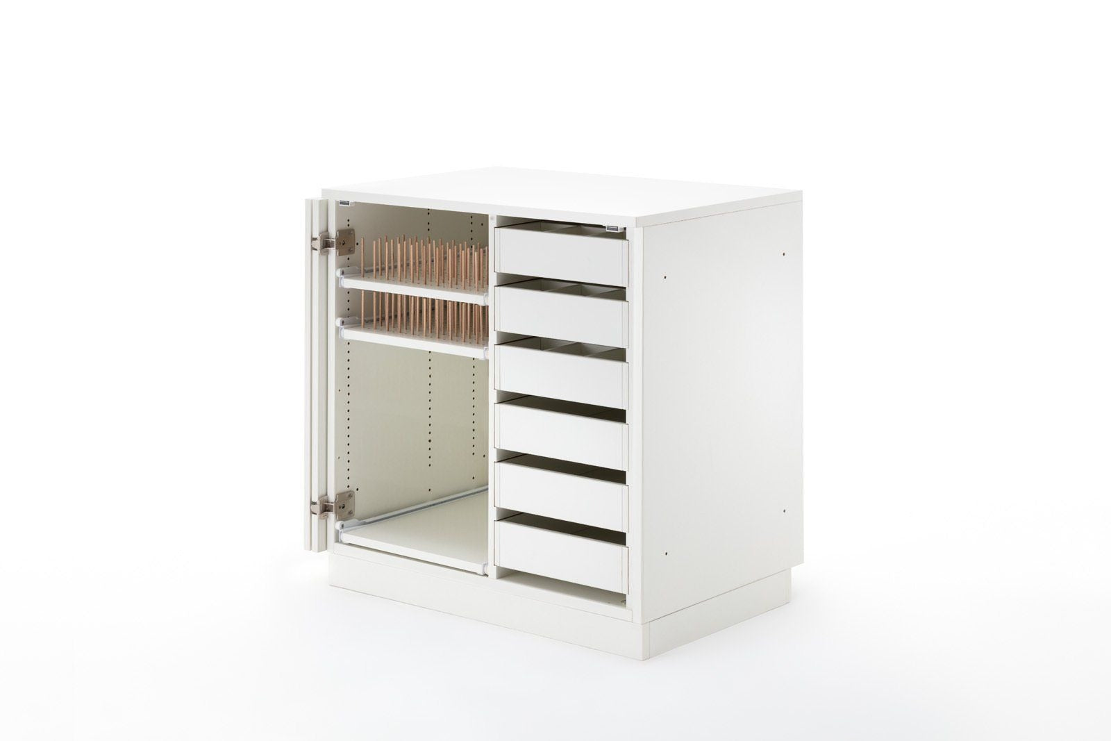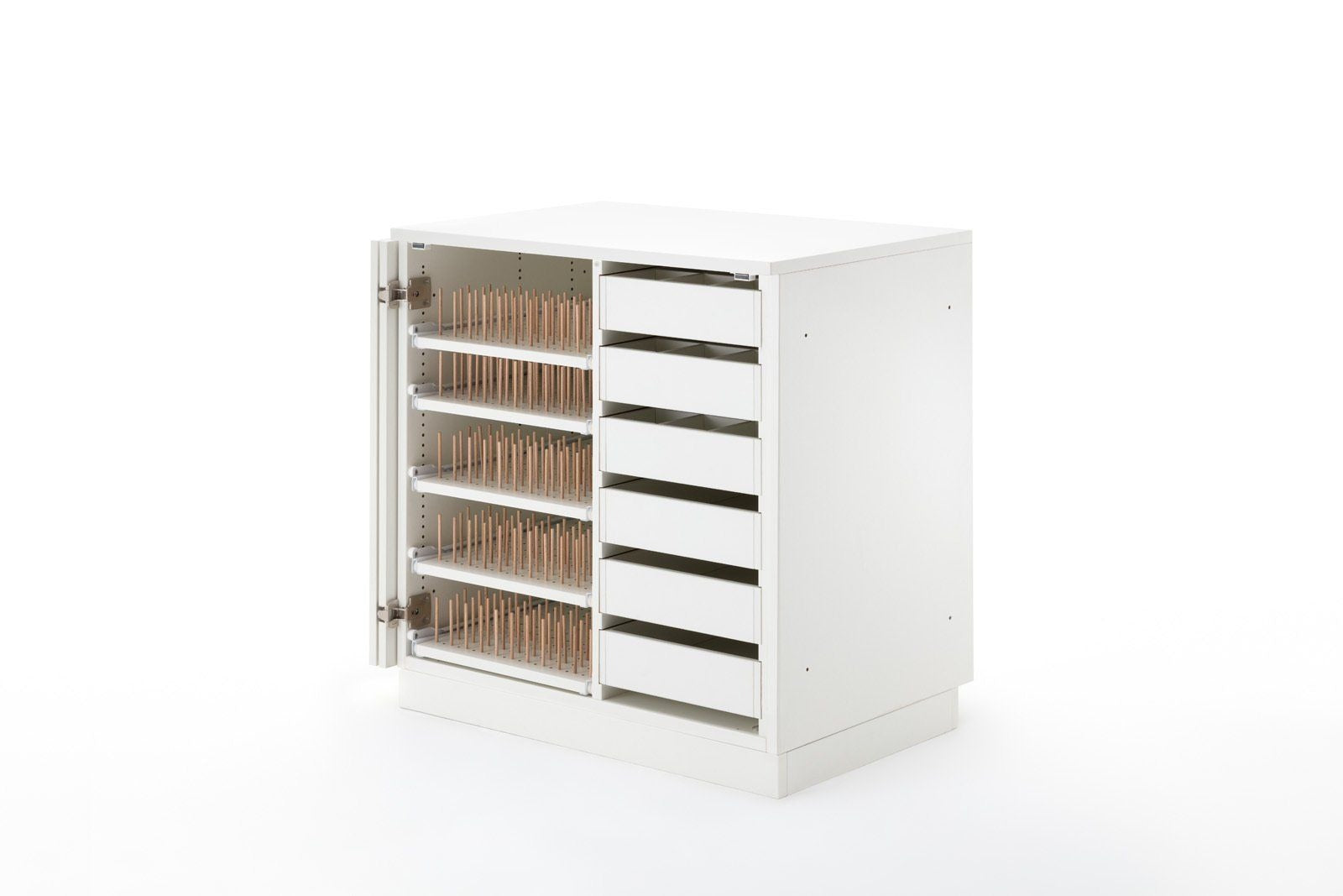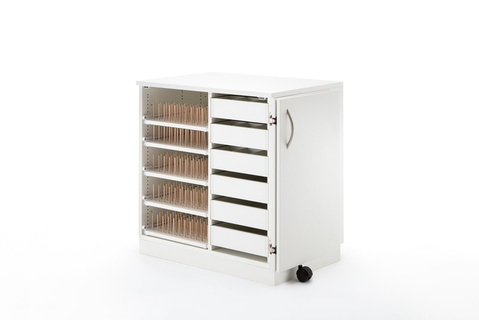 STACK fuller, das breite Zubehörmöbel, welches nach links und rechts mit weiteren Möbeln erweiterbar ist, bietet genügend Stauraum für den Start ins Hobby. Dieses Möbel ist wie folgt ausgestattet. Links befinden sich 5 Garnrollen-Auszüge mit folgenden Bestückungshöhen (von oben nach unten) 146mm, 79mm, 111mm, 111mm, 111mm, wobei diese jederzeit in der 16mm Lochreihe versetzt werden können. Auf diesen befinden sich gesamt ca. 1300 Löcher, für die wir 650 Holzstifte mitliefern. Auf der rechten Seite befinden sich 6 herausnehmbare Schubladen. Die oberen drei haben eine einzeln herausnehmbare Unterteilung, welche bis zu 12 kleine Fächer zulässt. Somit können Sie sich Ihre für Sie passsende Einteilung für Ihr Zubehör selbst gestalten. Die Schubladen haben eine Innenbreite von 275mm und eine Innentiefe von 430mm. Die Bestückungshöhe der obersten Schublade liegt bei 89mm, alle weiteren bei 75mm. Alle Möbel aus der BASE, EXTEND, und STACK Modellreihe können durch die vorgebohrten Metallverbindungsschrauben mit Hülsen miteinander verbunden werden. Sofern das nicht gewünscht ist, liegen Abdeckkappen in passender Farbe bei.