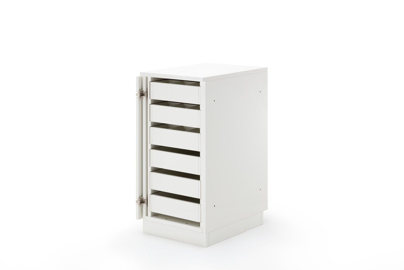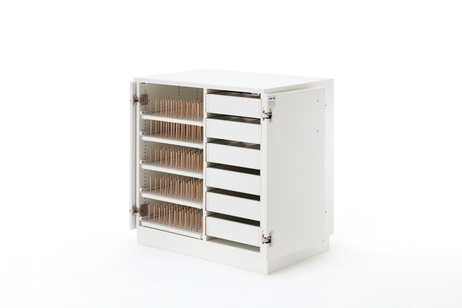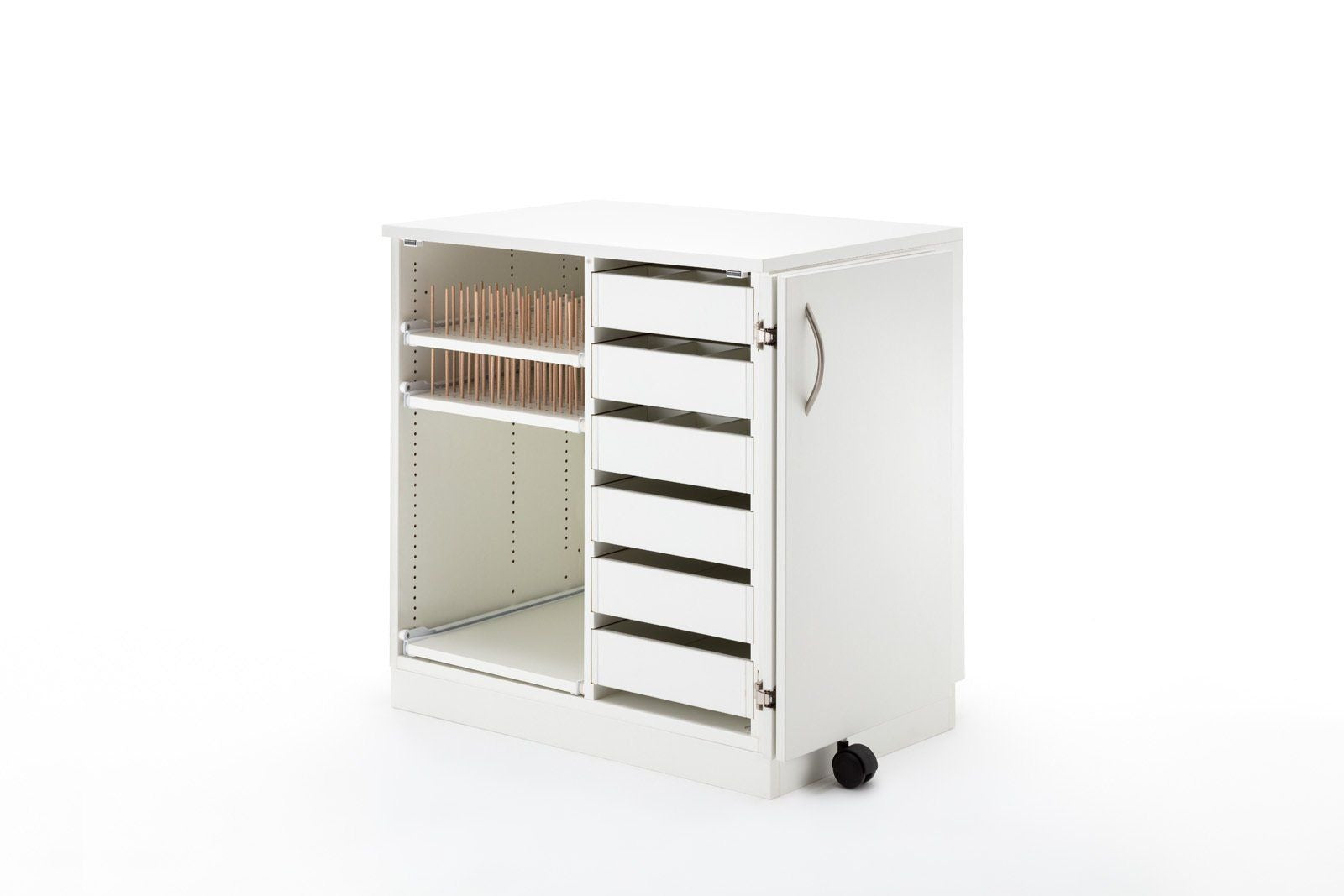 STACK fuller, das breite Zubehörmöbel, welches nach links und rechts mit weiteren Möbeln erweiterbar ist, bietet genügend Stauraum für den Start ins Hobby. Dieses Möbel ist wie folgt ausgestattet. Links befinden sich 5 Garnrollen-Auszüge mit folgenden Bestückungshöhen (von oben nach unten) 146mm, 79mm, 111mm, 111mm, 111mm, wobei diese jederzeit in der 16mm Lochreihe versetzt werden können. Auf diesen befinden sich gesamt ca. 1300 Löcher, für die wir 650 Holzstifte mitliefern. Auf der rechten Seite befinden sich 6 herausnehmbare Schubladen. Die oberen drei haben eine einzeln herausnehmbare Unterteilung, welche bis zu 12 kleine Fächer zulässt. Somit können Sie sich Ihre für Sie passsende Einteilung für Ihr Zubehör selbst gestalten. Die Schubladen haben eine Innenbreite von 275mm und eine Innentiefe von 430mm. Die Bestückungshöhe der obersten Schublade liegt bei 89mm, alle weiteren bei 75mm. Alle Möbel aus der BASE, EXTEND, und STACK Modellreihe können durch die vorgebohrten Metallverbindungsschrauben mit Hülsen miteinander verbunden werden. Sofern das nicht gewünscht ist, liegen Abdeckkappen in passender Farbe bei.