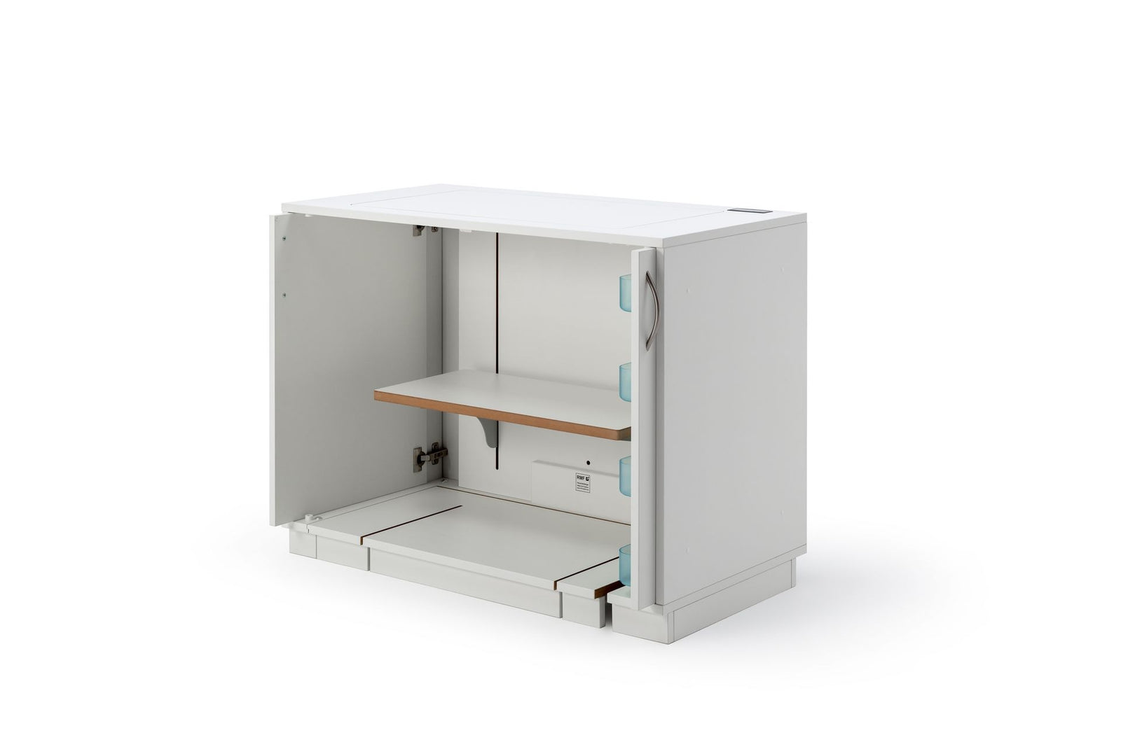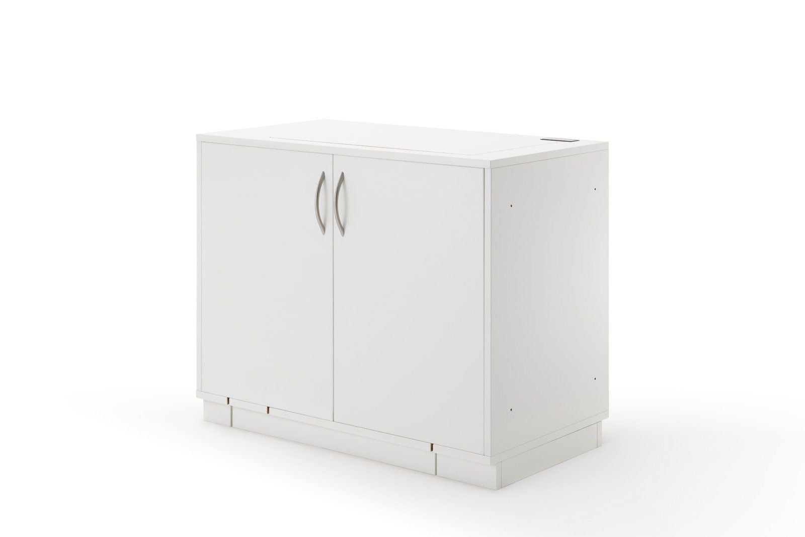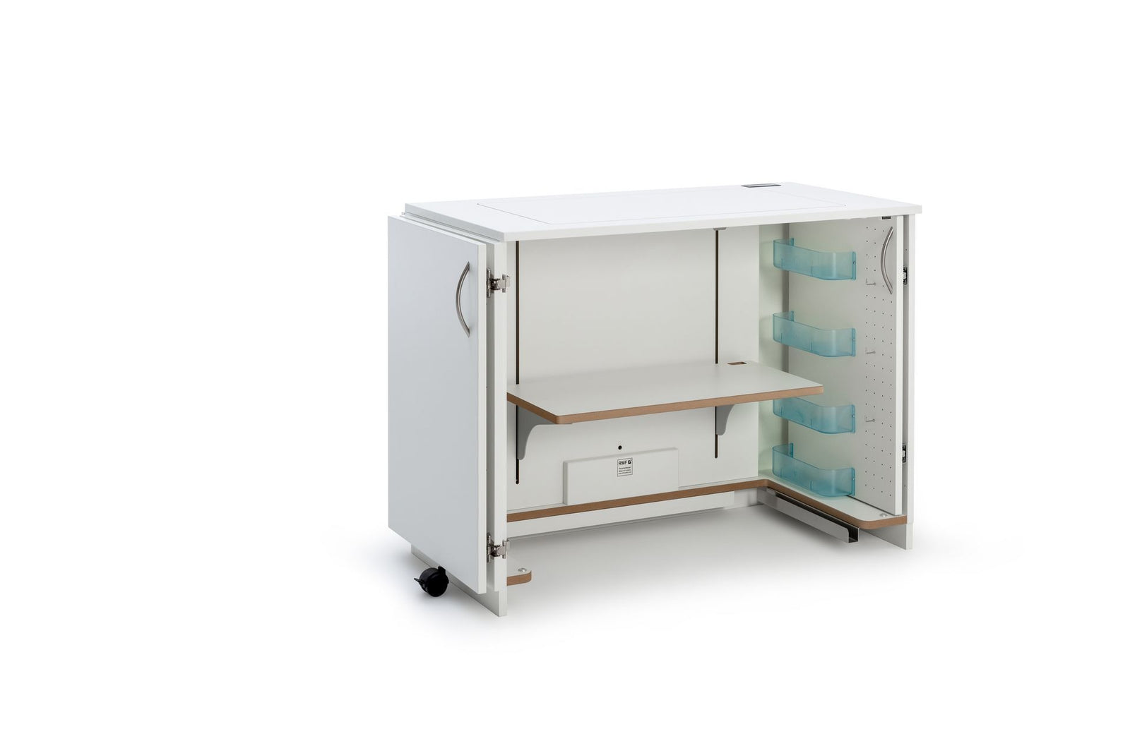 STACK sew folder mit einer Faltdrehtüre links oder rechts. Mit dieser Nähstation ist es nur möglich auf der gegenüberliegenden Seite der Türe weitere Zubehörcontainer anzubauen. Verbindungslöcher mit Gewindeschrauben dazugeörige Metallhülsen und Abdeckkappen machen eine feste Verbindung mehrerer Möbel möglich. Der eingebaute elektronisch gesteuerte RMF-patentierte easy-Softtech-Lift bewegt jedes Maschinengewicht mühelos. Das in der Platte eingelassene i-Touch Bedienfeld mit Lock-, und zwei Memoryfunktionen, runden die Bedienung ab. Die fest eingebaute 4-Fach-Steckerleiste mit Rückseitiger Kabeldurchführung bietet Ihnen alle nötigen Stromanschlüsse im Möbel. Durch den einheitlichen RMF – Simply-5 Ausschnitt ist der Nähtisch kompatibel mit allen Haushalt-Maschinentypen, egal ob Nähmaschine, Stickmaschine, Overlockmaschine oder Coverlockmaschine. Die auf der rechten Innenwand vorgesehene Zwischenraum bietet Platz für bis zu 3 Freiarmeinlage. Der großzügig gestaltete Fußraum bietet die nötige Beinfreiheit.