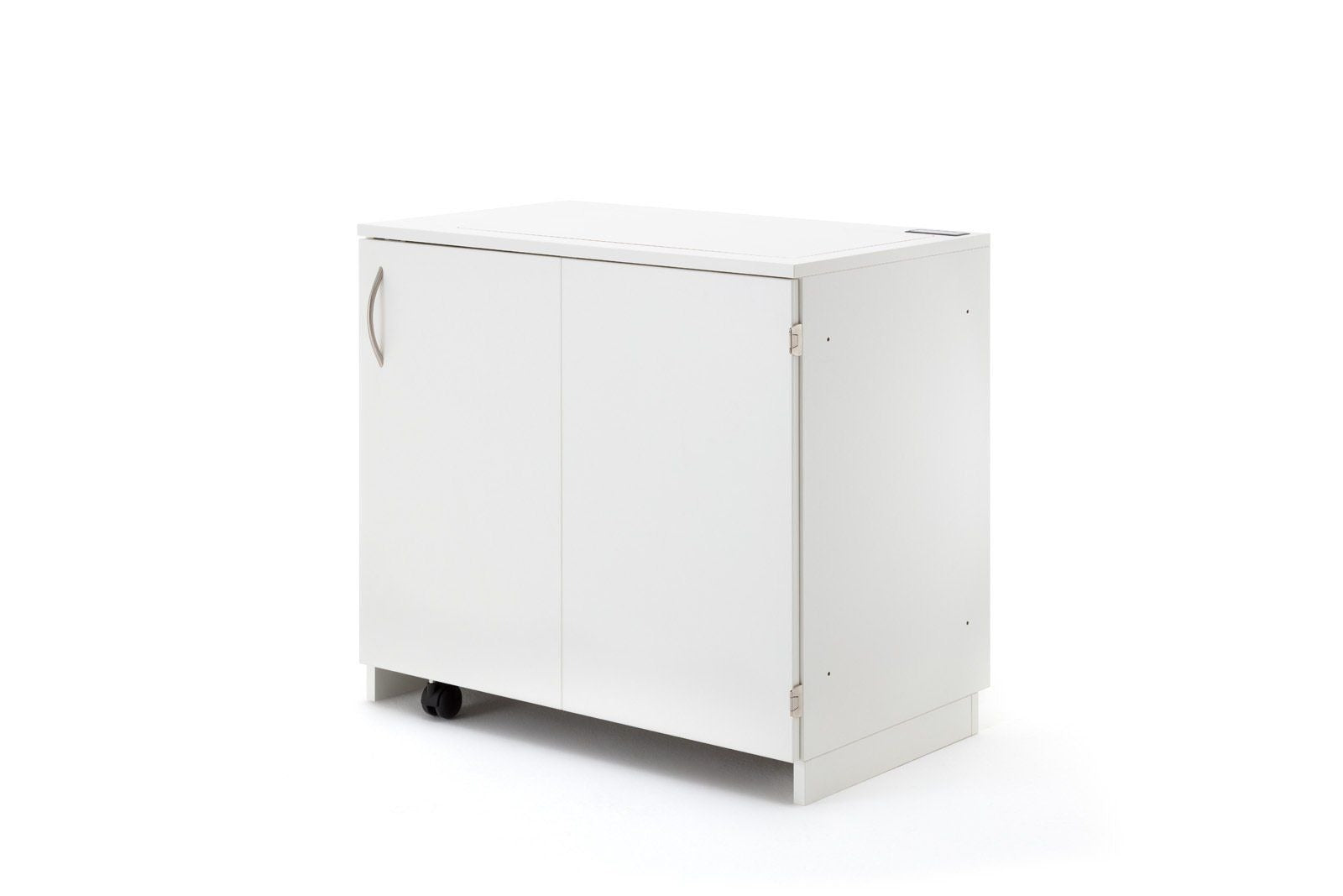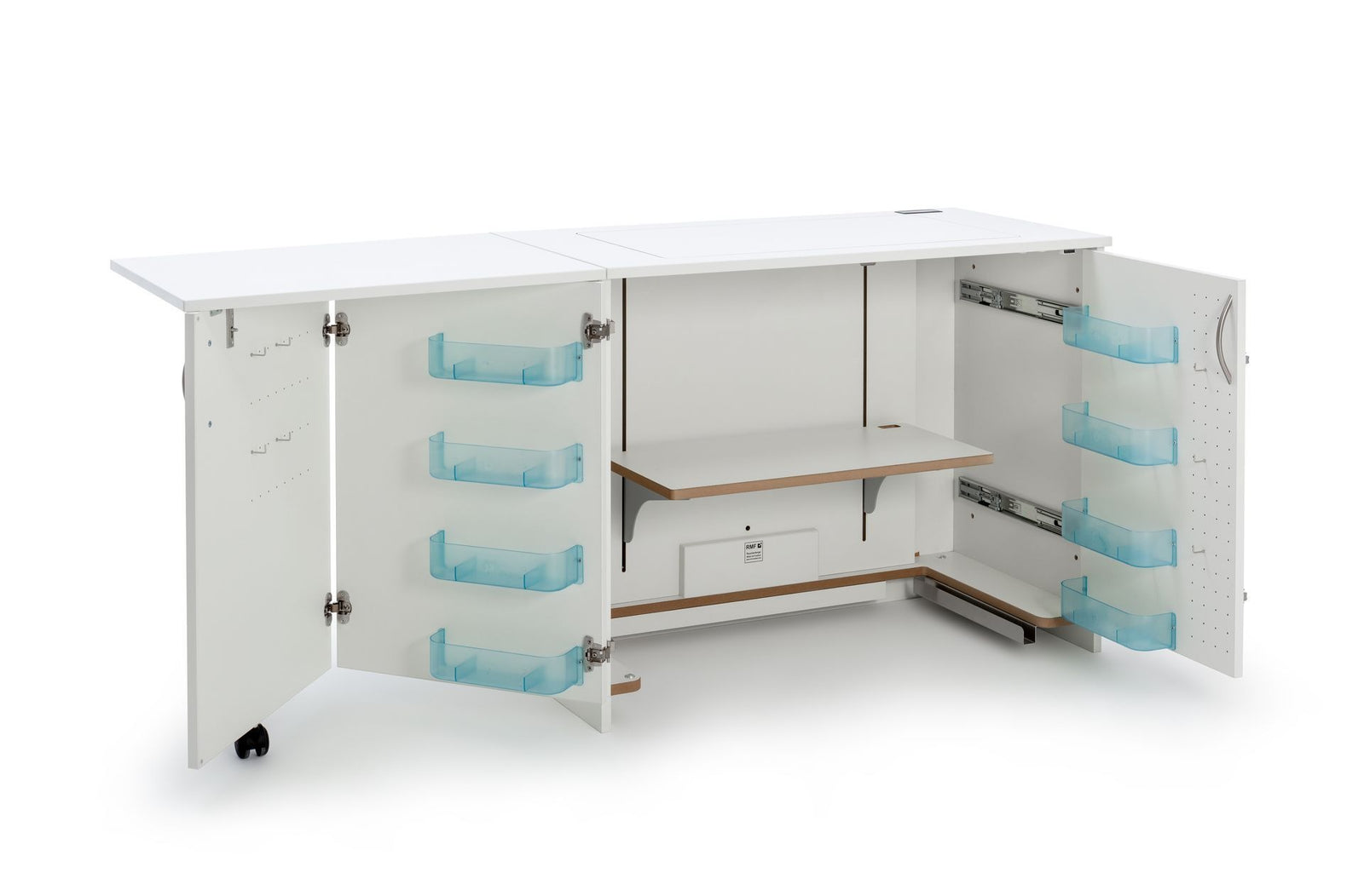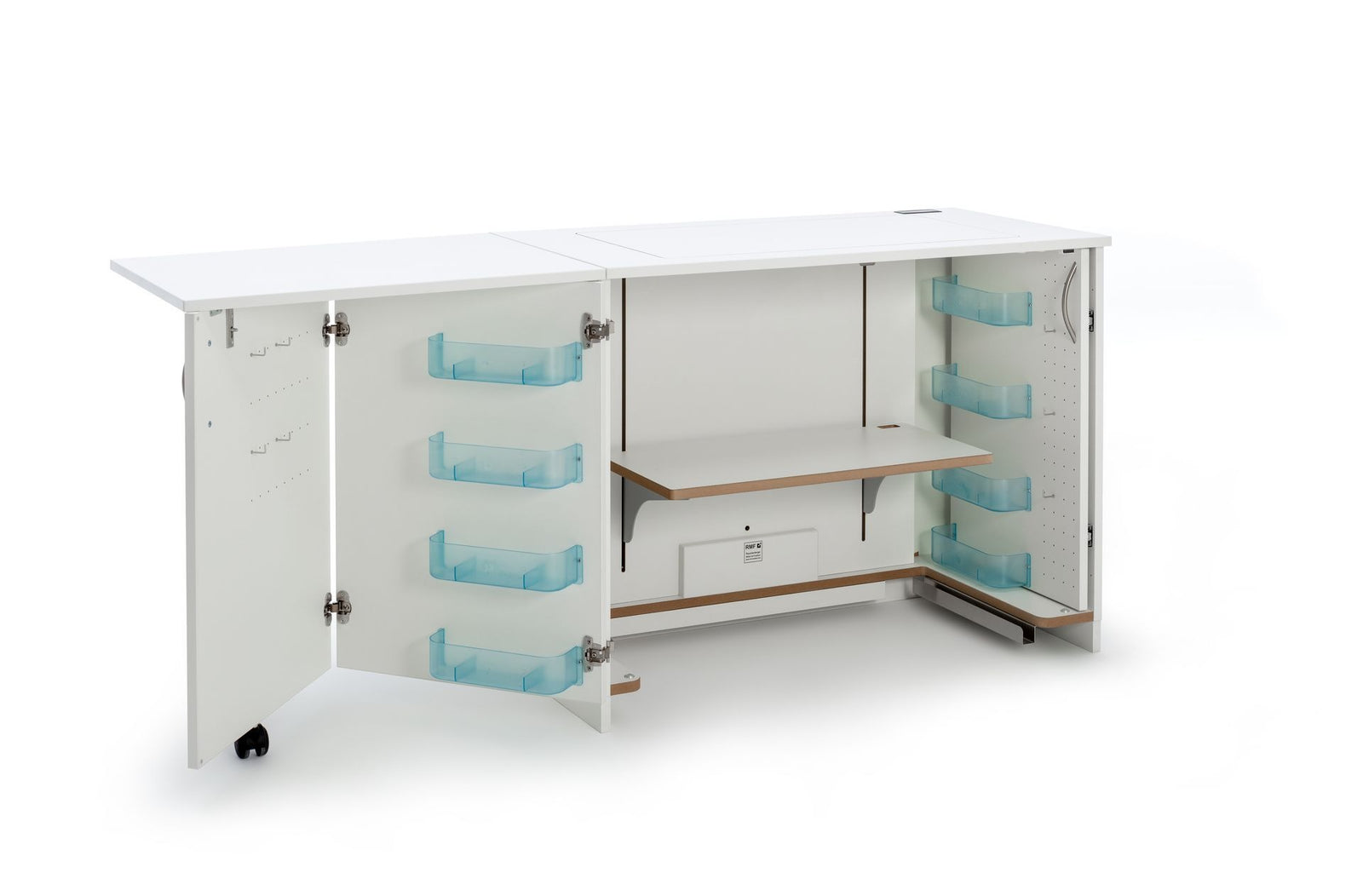 STACK sew inner mit zwei platzsparenden Einschiebetüren. Mit dieser Nähstation ist es möglich beidseitig weitere Möbel und Eckversionen für seinen Näh-, und Hobbyplatz anzubauen. Verbindungslöcher mit Gewindeschrauben dazugeörige Metallhülsen und Abdeckkappen machen eine feste Verbindung mehrerer Möbel möglich. Der eingebaute elektronisch gesteuerte RMF-patentierte easy-Softtech-Lift bewegt jedes Maschinengewicht mühelos. Das in der Platte eingelassene i-Touch Bedienfeld mit Lock-, und zwei Memoryfunktionen, runden die Bedienung ab. Die fest eingebaute 4-Fach-Steckerleiste mit Rückseitiger Kabeldurchführung bietet Ihnen alle nötigen Stromanschlüsse im Möbel. Durch den einheitlichen RMF – Simply-5 Ausschnitt ist der Nähtisch kompatibel mit allen Haushalt-Maschinentypen, egal ob Nähmaschine, Stickmaschine, Overlockmaschine oder Coverlockmaschine. Die auf der rechten Innenwand vorgesehene Zwischenraum bietet Platz für bis zu 3 Freiarmeinlage. Der großzügig gestaltete Klappboden schafft den nötigen großen Fußraum.