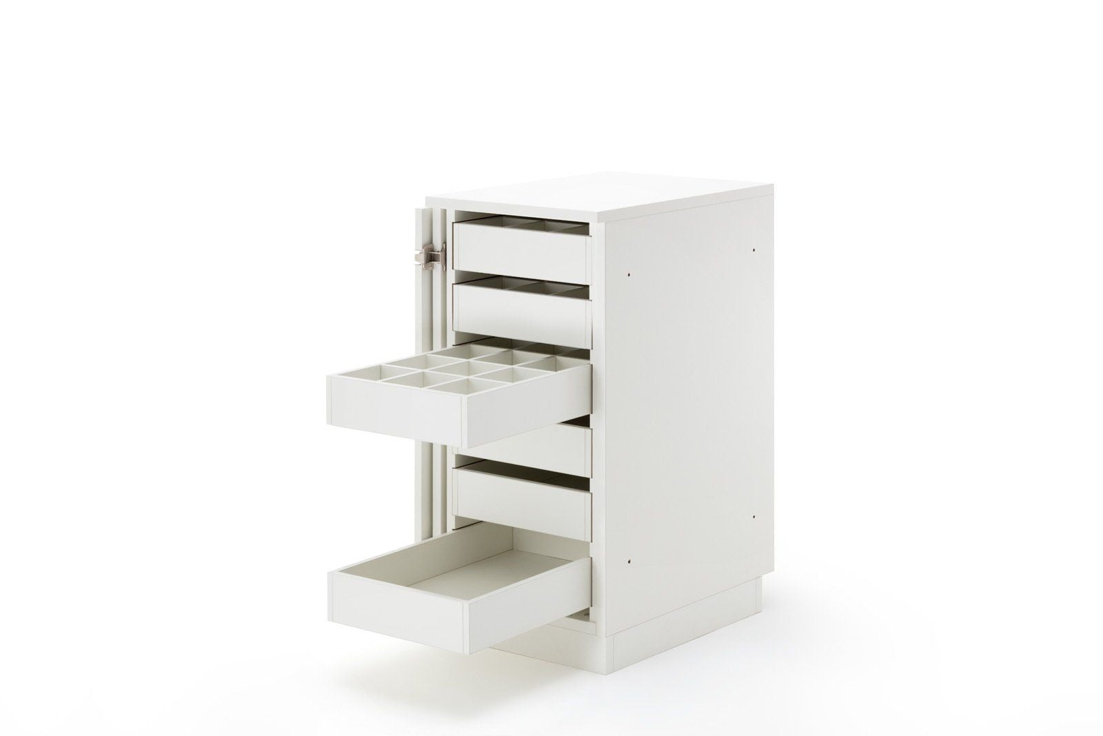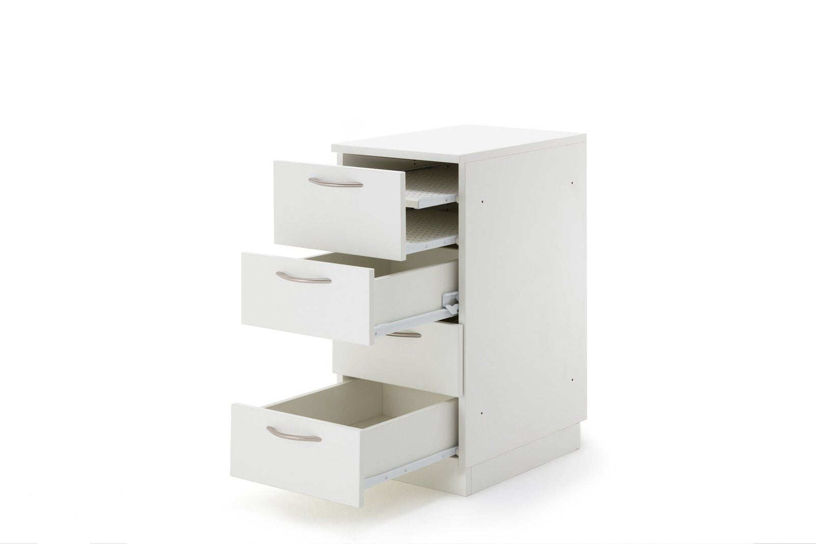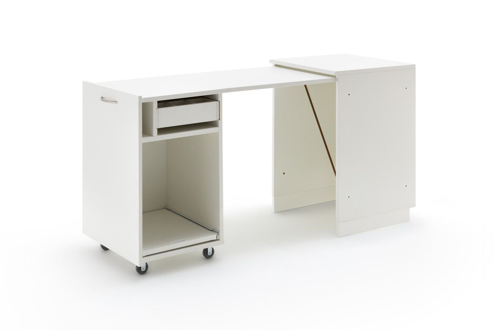 STACK duo, der 520mm breite Auszugcontainer um sich in den Raum oder die Ecke zusätzliche Arbeitsfläche zu schaffen. Dieses ausgeklügelte Auszugssystem zaubert aus einem Möbel ein weiteres Möbel mit zusätzlichem Stauraum für Kleinteile und eine weitere Maschine. Die obere Schublade hat die Innenmaße von einer Länge von 430mm, eine Breite von 275mm. Die maximale Beladungshöhe liegt bei 90mm. Das rechte obere schmale Staufach hat die folgenden Innenabmessungen HBT: 90 x 57 x 458mm. Im unteren Bereich befindet sich der Teilauszugsboden für eine Zweitmaschinen oder Overlockmaschine. Das maximale Innenmaß liegt bei HBT 460 x 365 x 458mm. Messen Sie unbedingt Ihre Maschine. Für größere Maschinen gibt es den „duo“ auch als XL-Version. Alle Möbel aus der BASE, EXTEND, und STACK Modellreihe können durch die vorgebohrten Metallverbindungsschrauben mit Hülsen miteinander verbunden werden. Sofern das nicht gewünscht ist, liegen Abdeckkappen in passender Farbe bei.