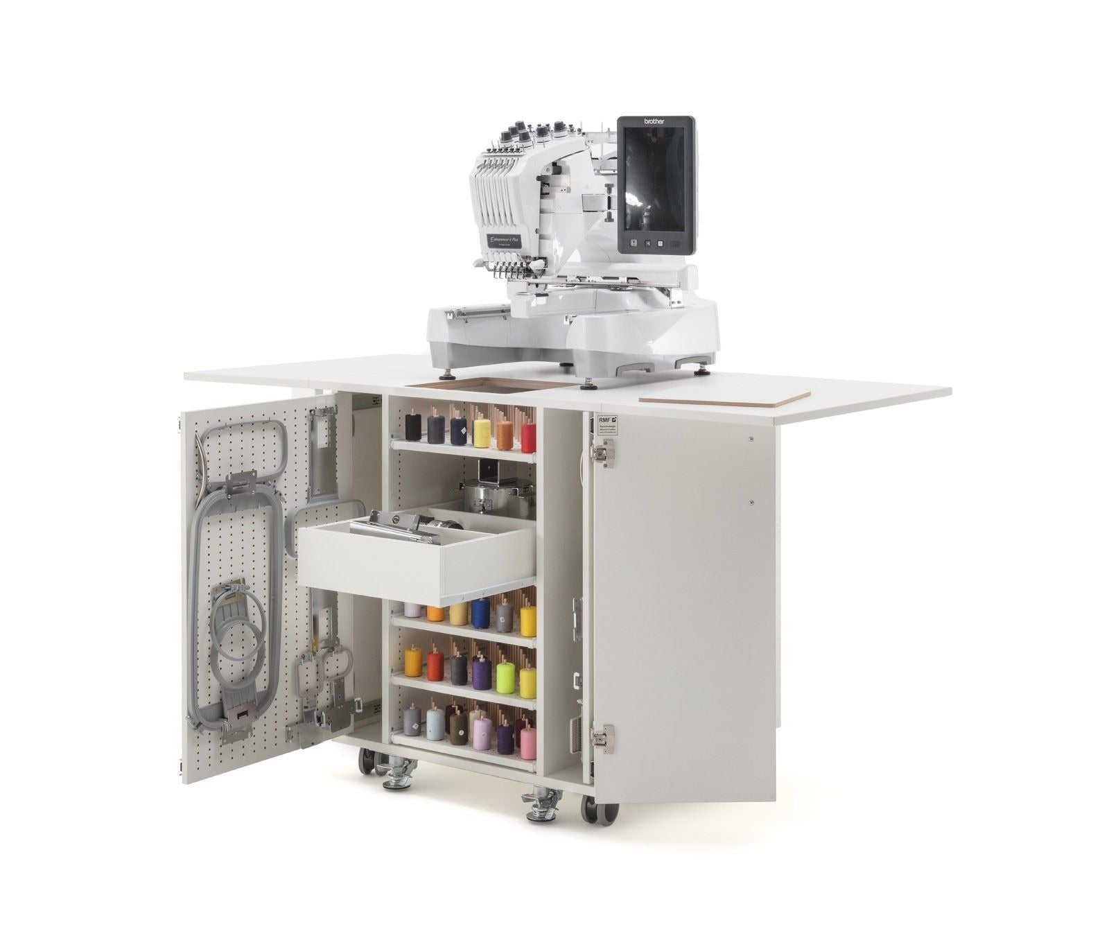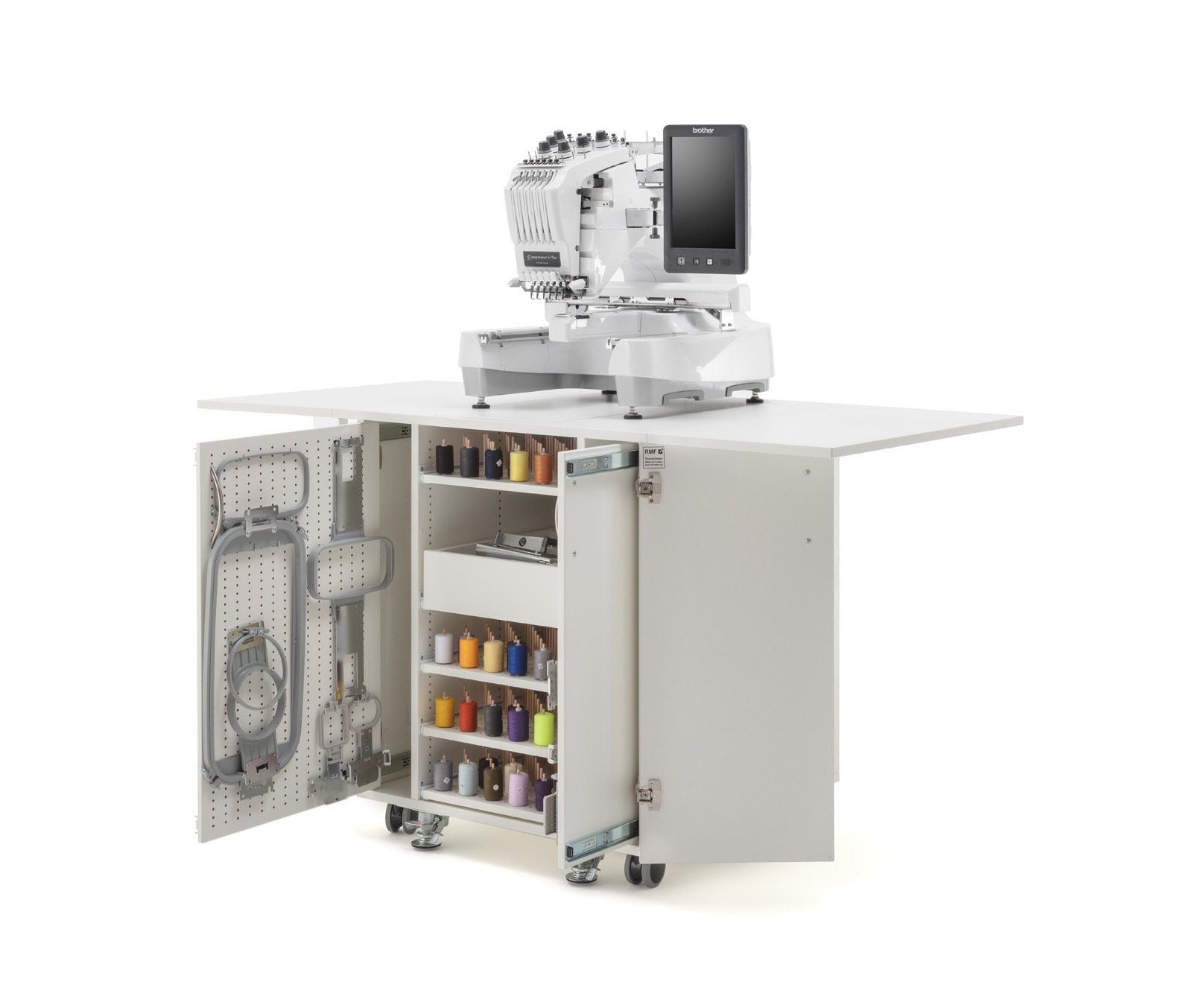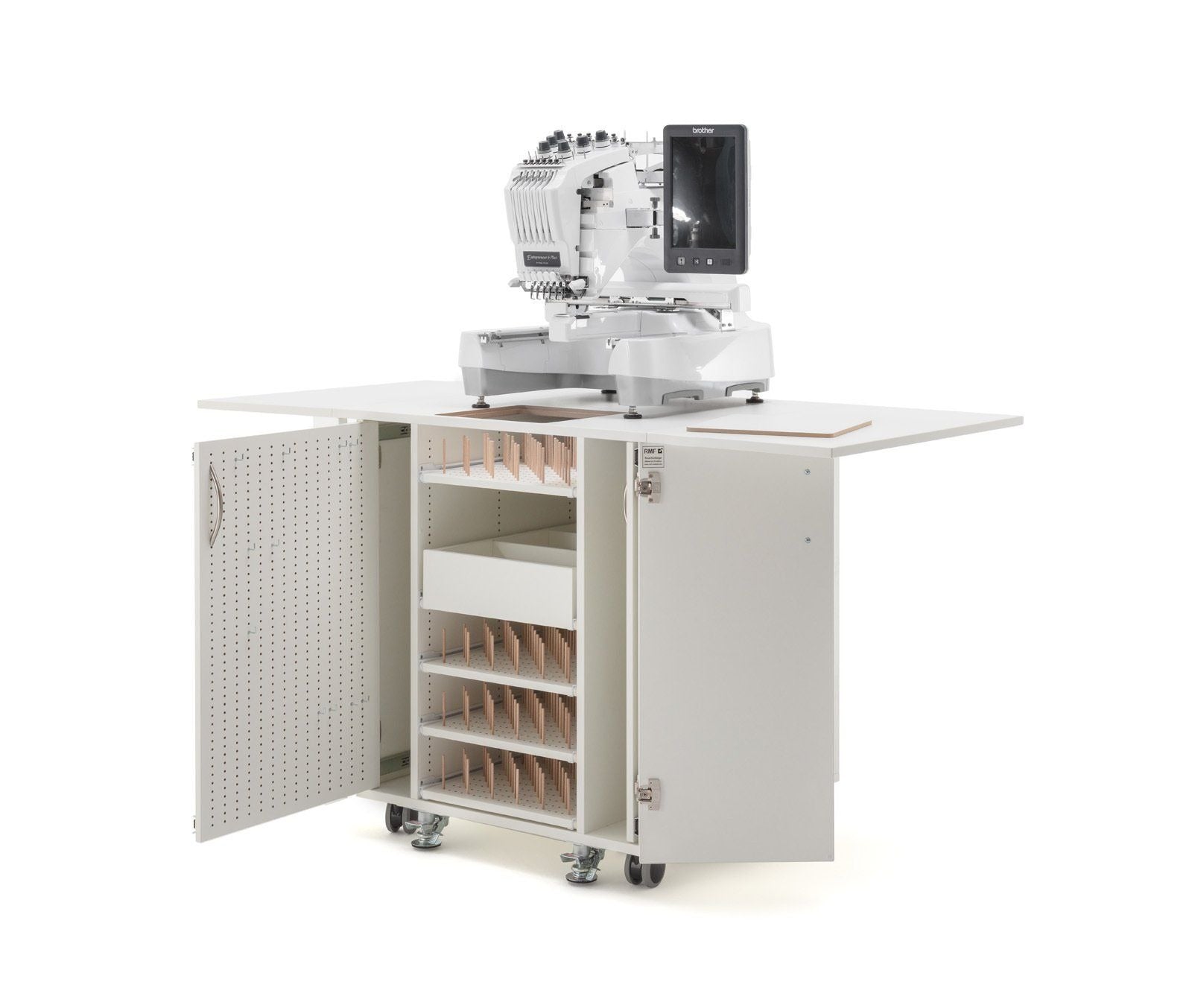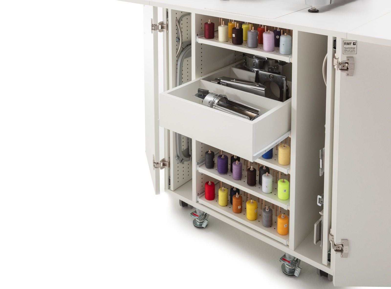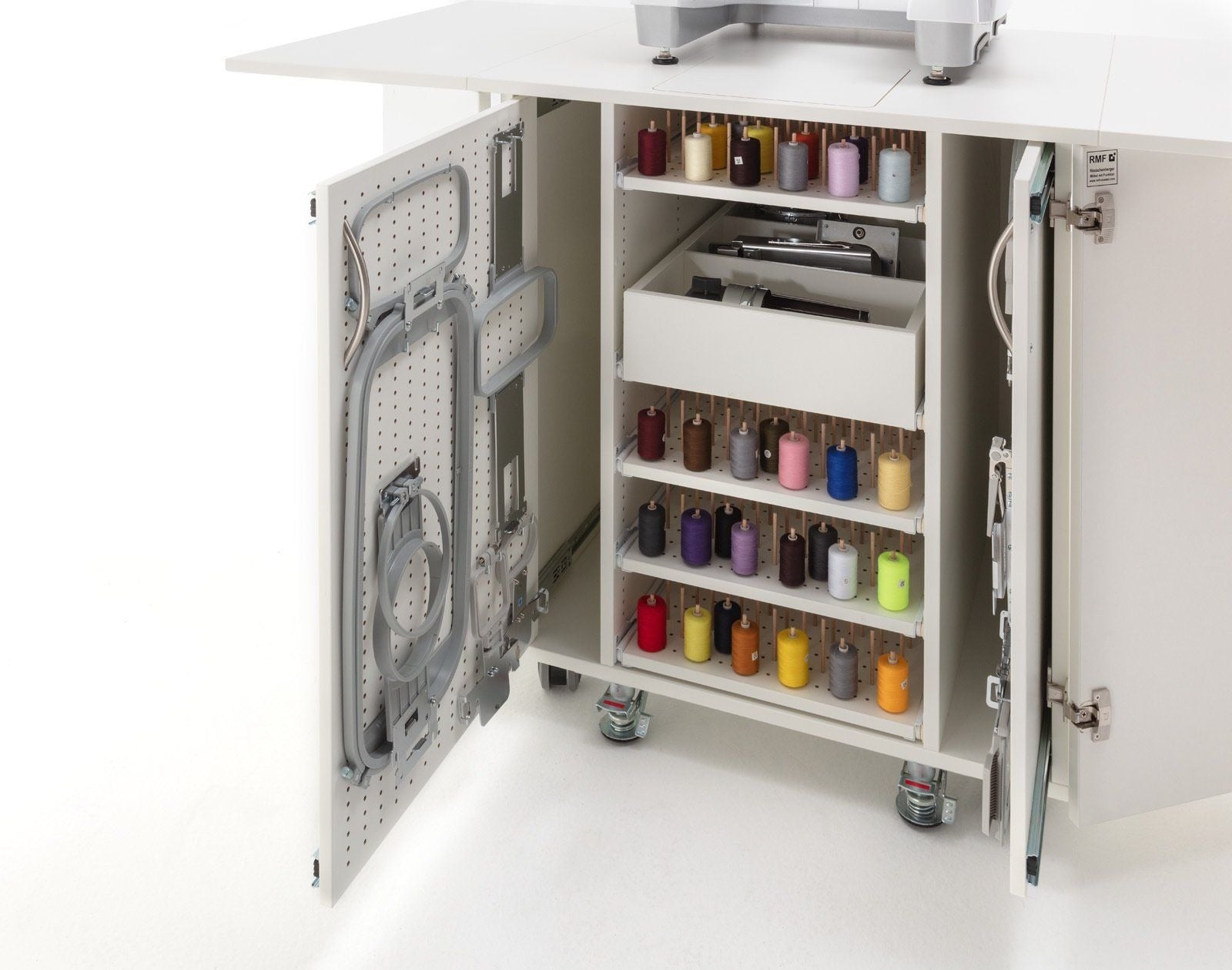Endlich Ordnung beim Profisticken. Ein einzigartiger Schrank mit durchdachtem Ordnungssystem für das komplette Zubehör welches man für die Profi-Stickmaschinen benötigt. Dieses Möbel ist für jede schwere Stickmaschine geeignet. Große Rollen mit sehr stabilen massiven Metall-Bodenfeststellern sorgen für absolute Standfestigkeit. Hohe Qualität und Statik runden dieses Funktionsmöbel ab.