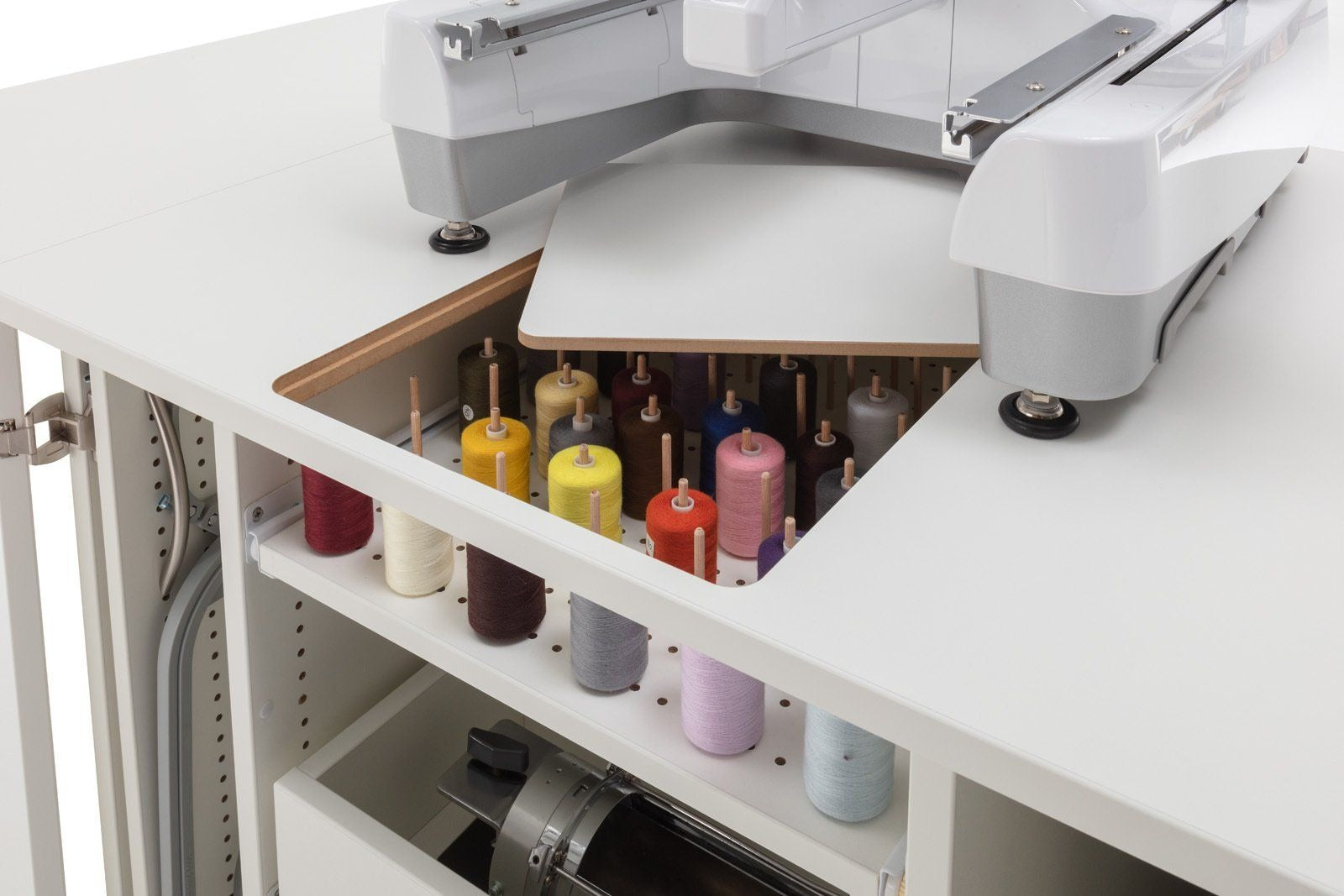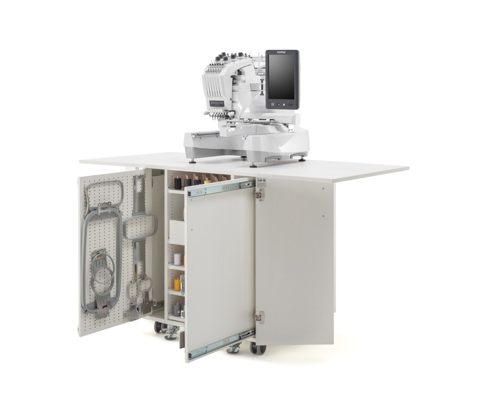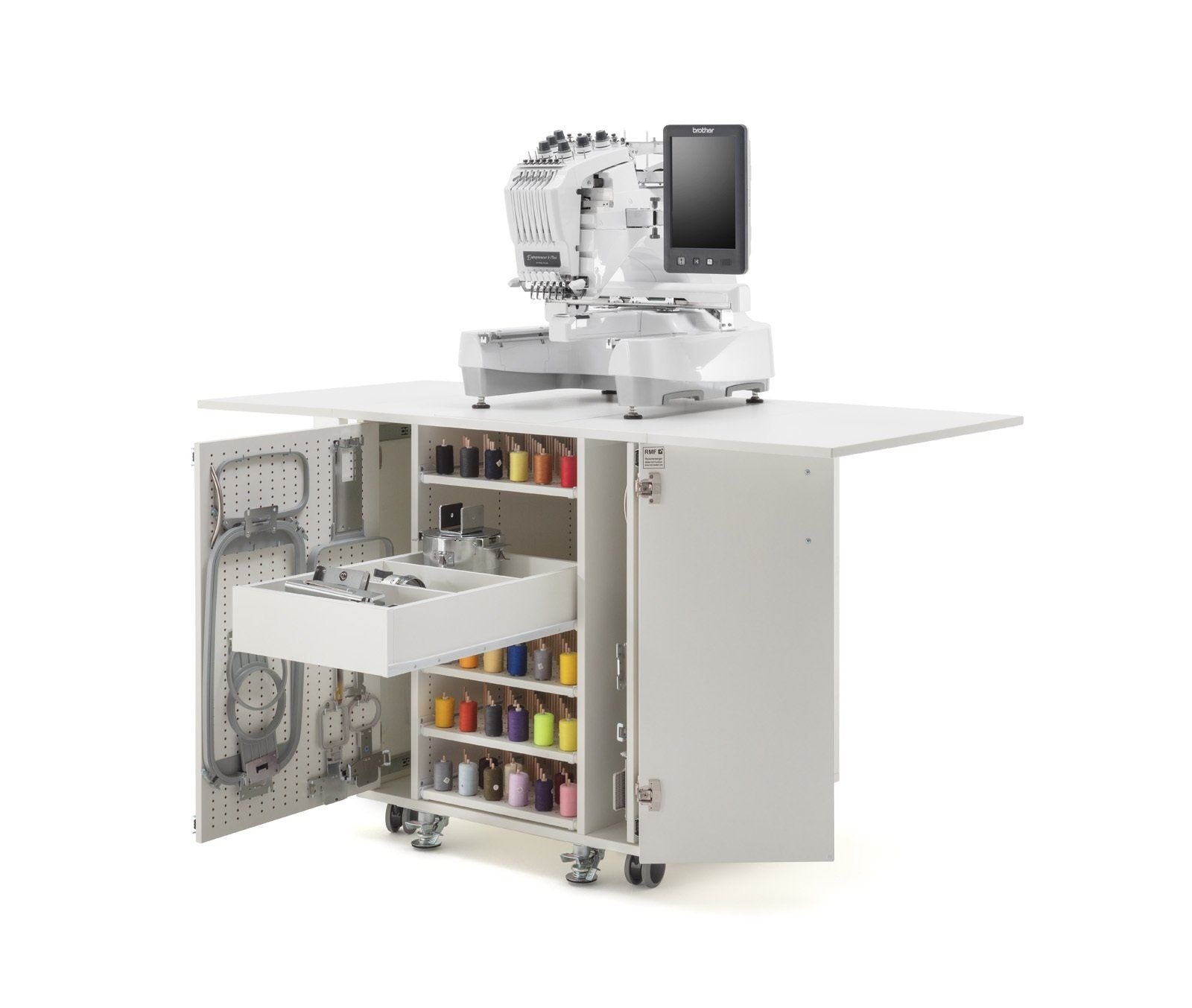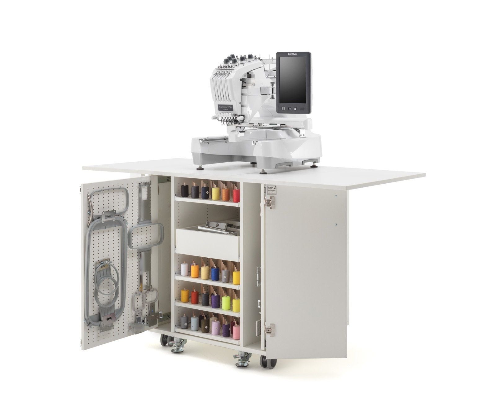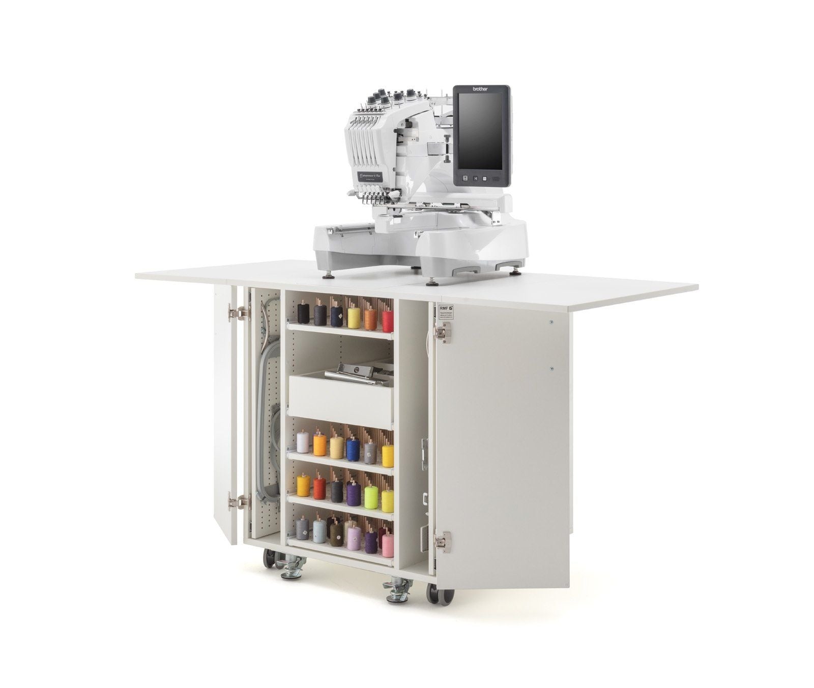 Endlich Ordnung beim Profisticken. Ein einzigartiger Schrank mit durchdachtem Ordnungssystem für das komplette Zubehör welches man für die Profi-Stickmaschinen benötigt. Dieses Möbel ist für jede schwere Stickmaschine geeignet. Große Rollen mit sehr stabilen massiven Metall-Bodenfeststellern sorgen für absolute Standfestigkeit. Hohe Qualität und Statik runden dieses Funktionsmöbel ab.