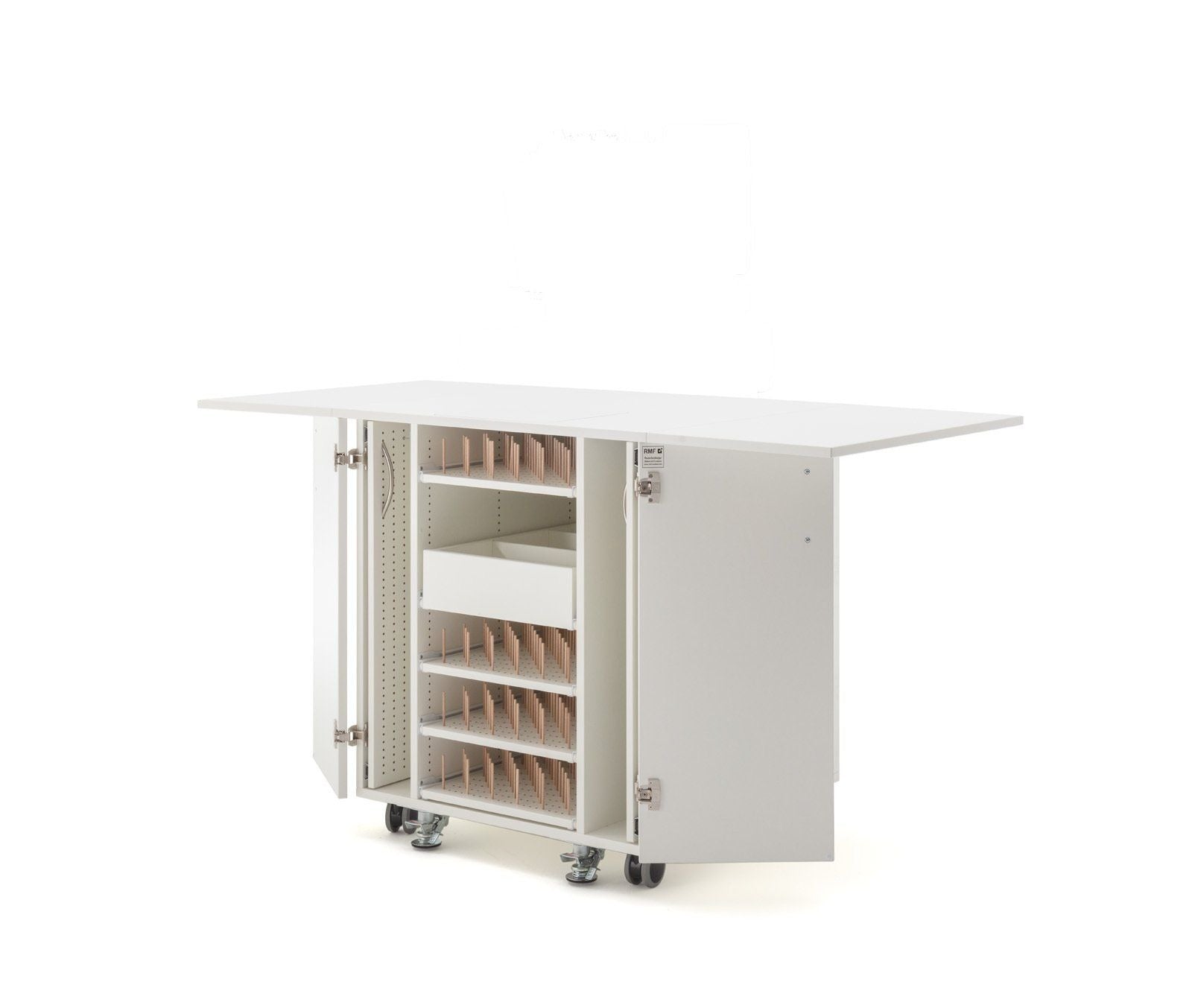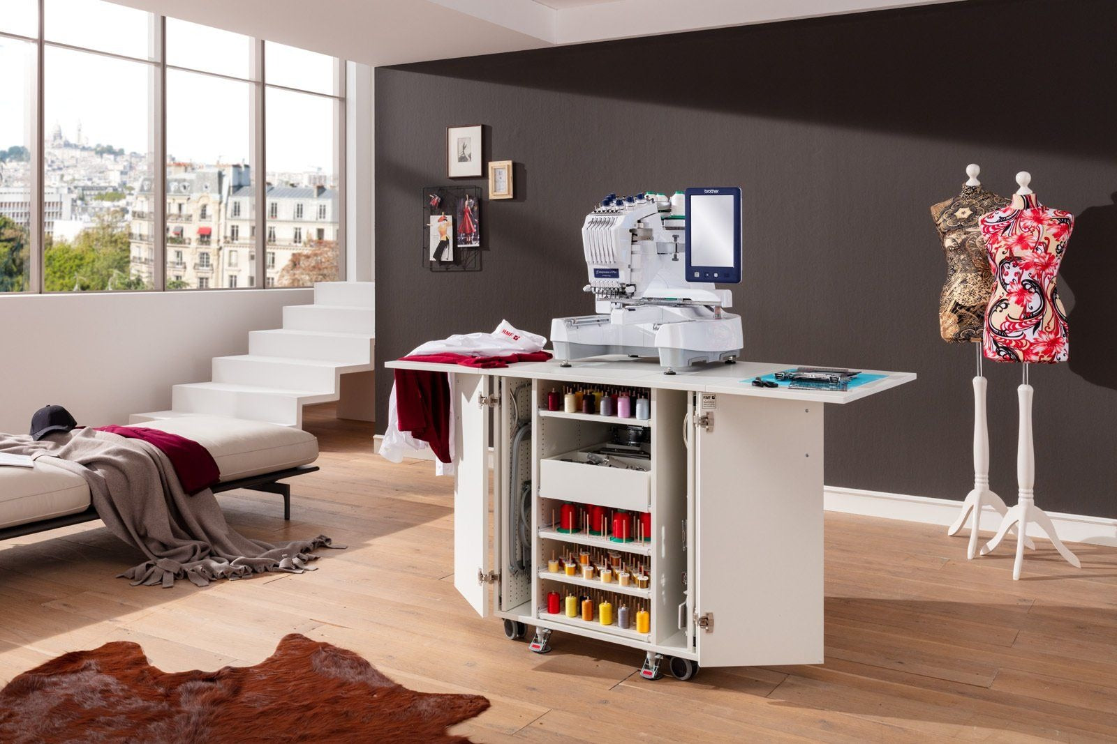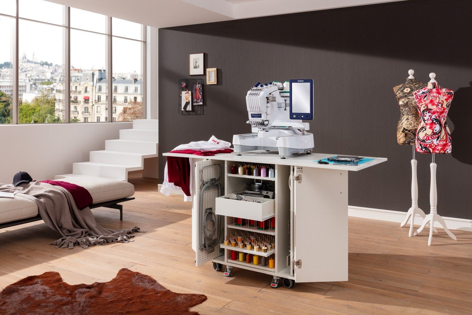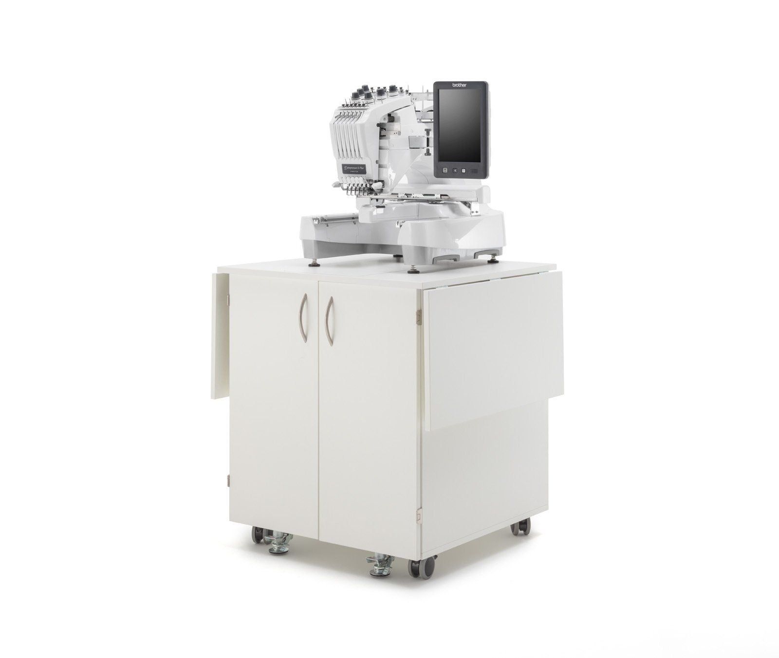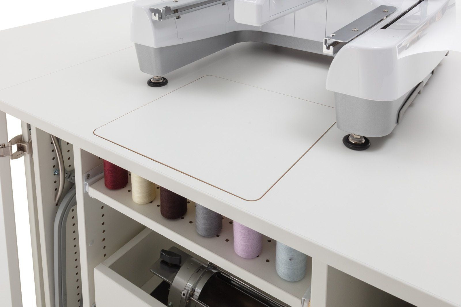 Endlich Ordnung beim Profisticken. Ein einzigartiger Schrank mit durchdachtem Ordnungssystem für das komplette Zubehör welches man für die Profi-Stickmaschinen benötigt. Dieses Möbel ist für jede schwere Stickmaschine geeignet. Große Rollen mit sehr stabilen massiven Metall-Bodenfeststellern sorgen für absolute Standfestigkeit. Hohe Qualität und Statik runden dieses Funktionsmöbel ab.