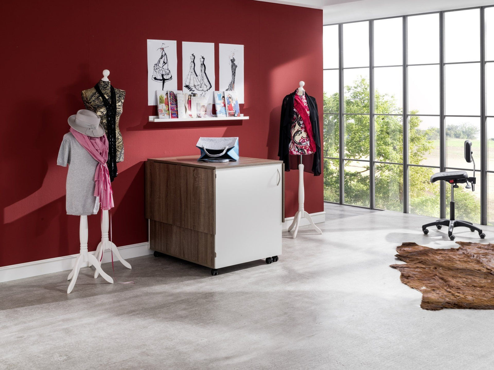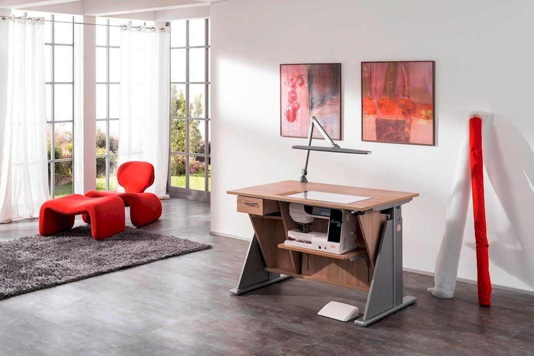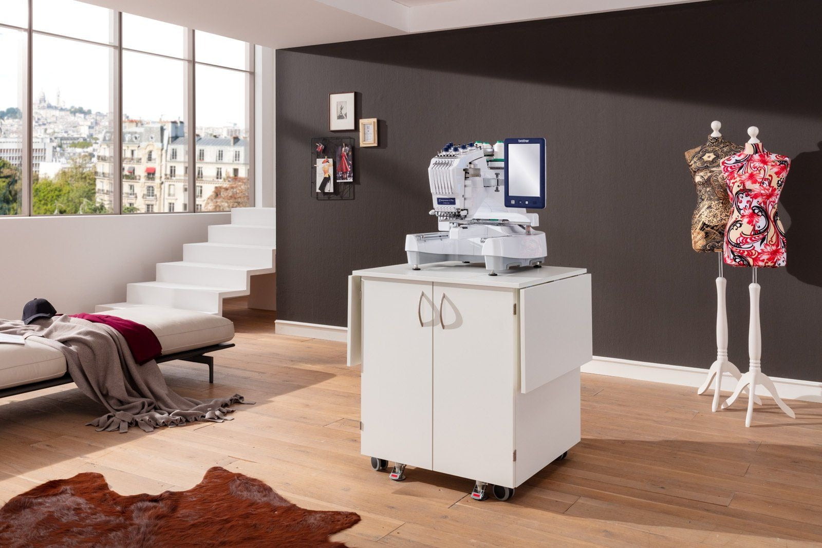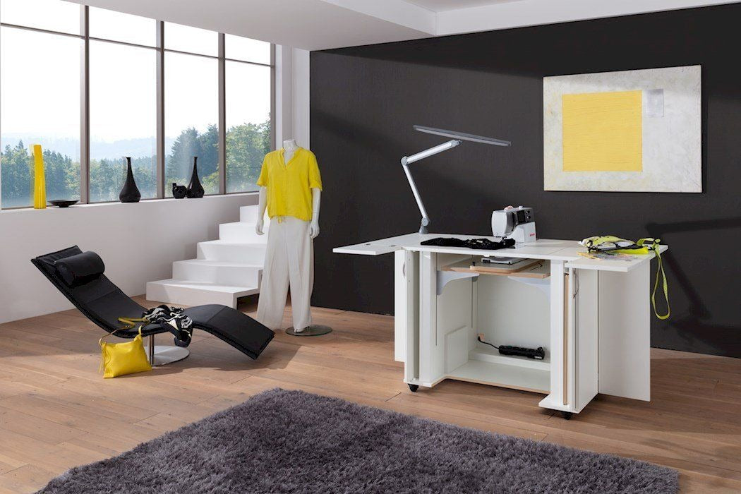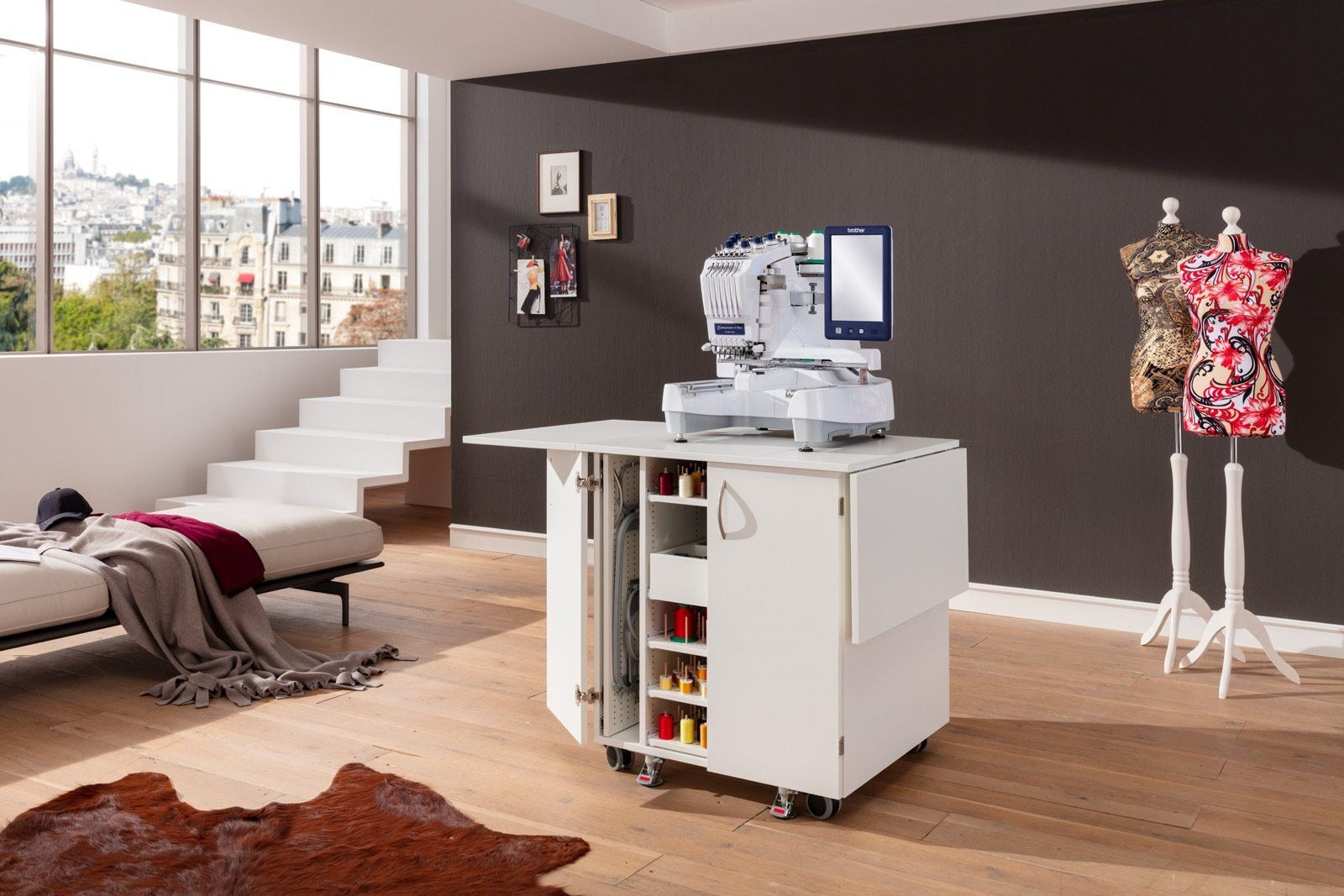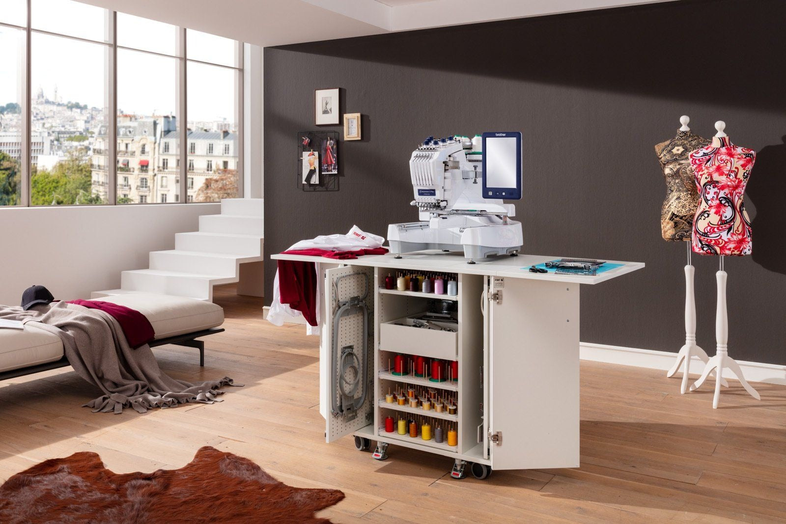 Endlich Ordnung beim Profisticken. Ein einzigartiger Schrank mit durchdachtem Ordnungssystem für das komplette Zubehör welches man für die Profi-Stickmaschinen benötigt. Dieses Möbel ist für jede schwere Stickmaschine geeignet. Große Rollen mit sehr stabilen massiven Metall-Bodenfeststellern sorgen für absolute Standfestigkeit. Hohe Qualität und Statik runden dieses Funktionsmöbel ab.
