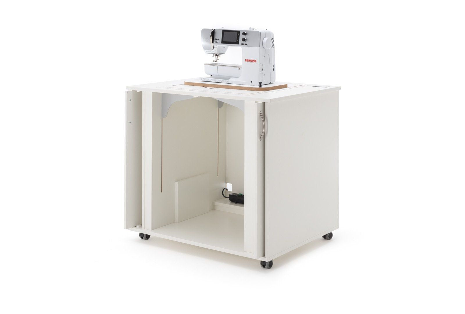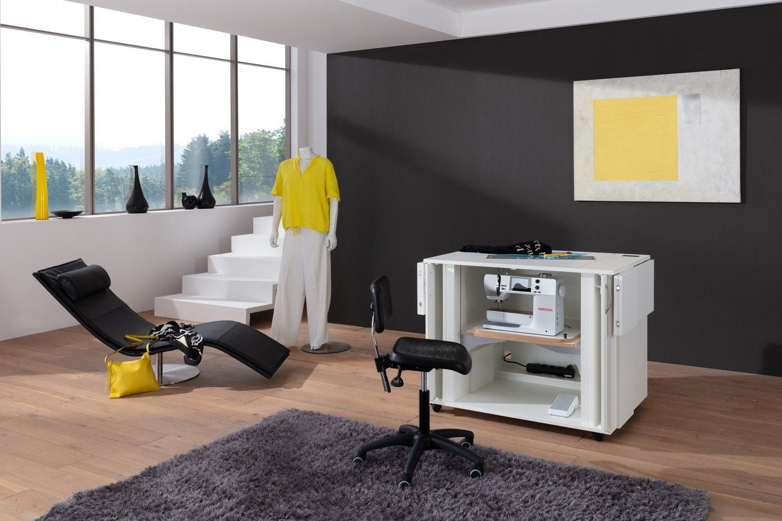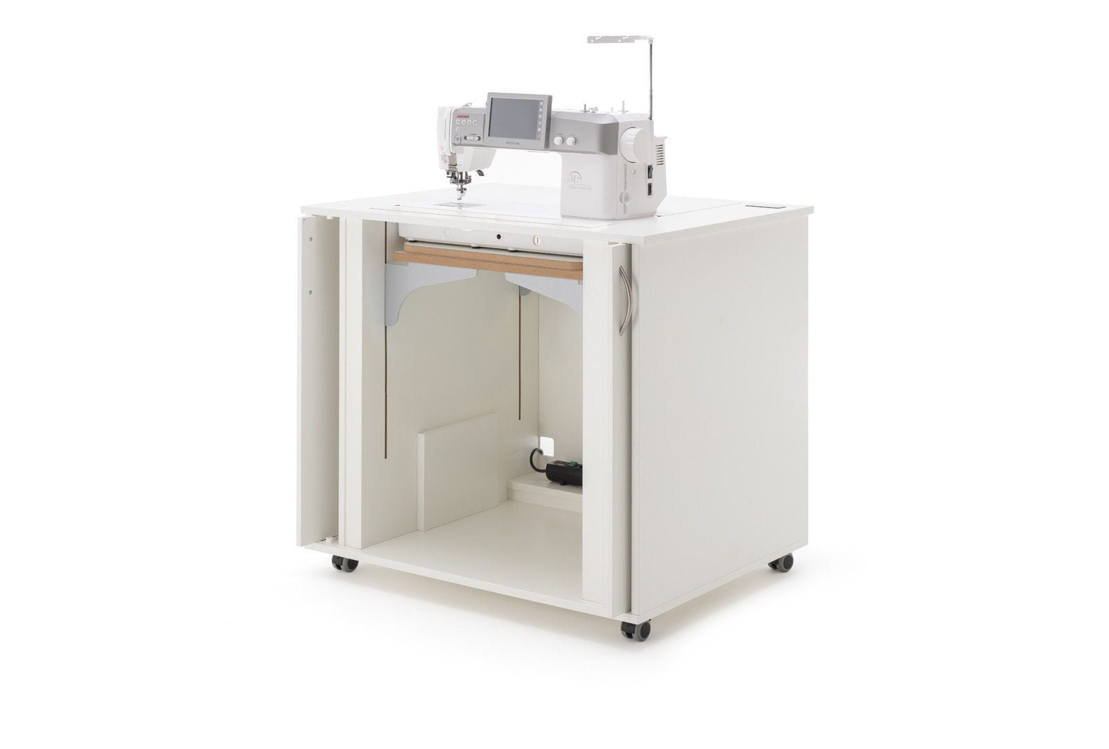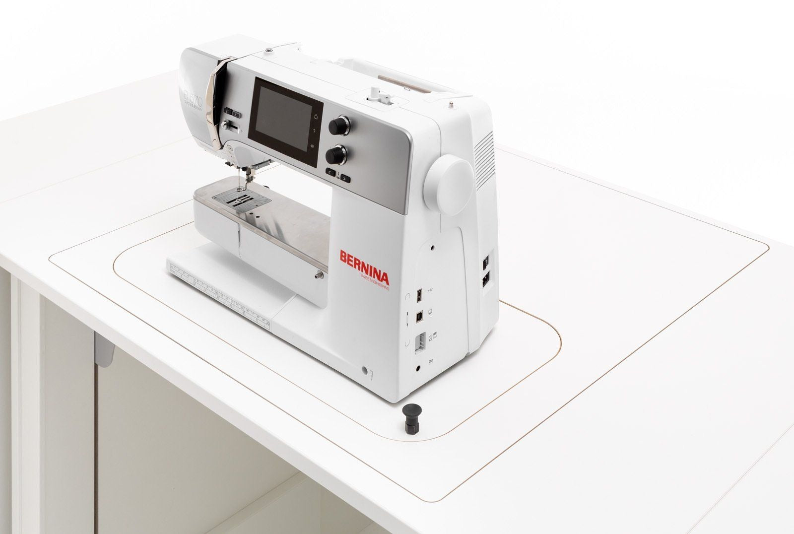 Unsere Revolution zum Nähen und Quilten in 90° auf einem Level, mit dem von uns entwickelten Schiebe-, und Drehmechanismus. Die Maschine kann auf dem Liftbrett um 90 Grad zwangsgeführt verdreht werden kann. Somit ist ein Quilten wie mit einer Longarm-Quiltmaschine möglich. Die für Ihre Maschine passende Freiarmeinlage ob quer oder in 90° gedreht bieten wir für alle Haushalt-Nähmaschinen an. Egal ob Sie Freiarm Nähen, Sticken, oder Ihre Maschine komplett versenken wollen, die beiden gekoppelten elektronisch gesteuerte RMF – easy-Softtech Lift bewegen jedes Maschinengewicht mühelos und bieten absolute Stabilität in jeder Lage. Das in der Platte eingelassene i-Touch Bedienfeld mit Lock-, zwei Momoryfunktionen , und einer Auf und Ab Funktion runden die Bedienung ab. Durch den neuen großen RMF – Simply-7 Ausschnitt ist der Nähtisch kompatibel für alle Haushalt-Nämaschinen. Die beiden Einschiebetüren verschwinden fast unsichtbar in das Innere des Möbels. Mit unserer Stuhlserie CHAIR one und CHAIR two sitzen Sie auch an diesem Möbel immer in der ergonomisch perfekten Höhe und Haltung.