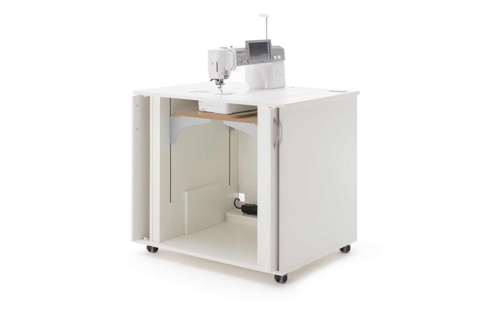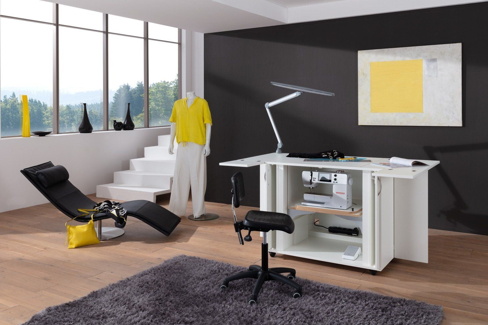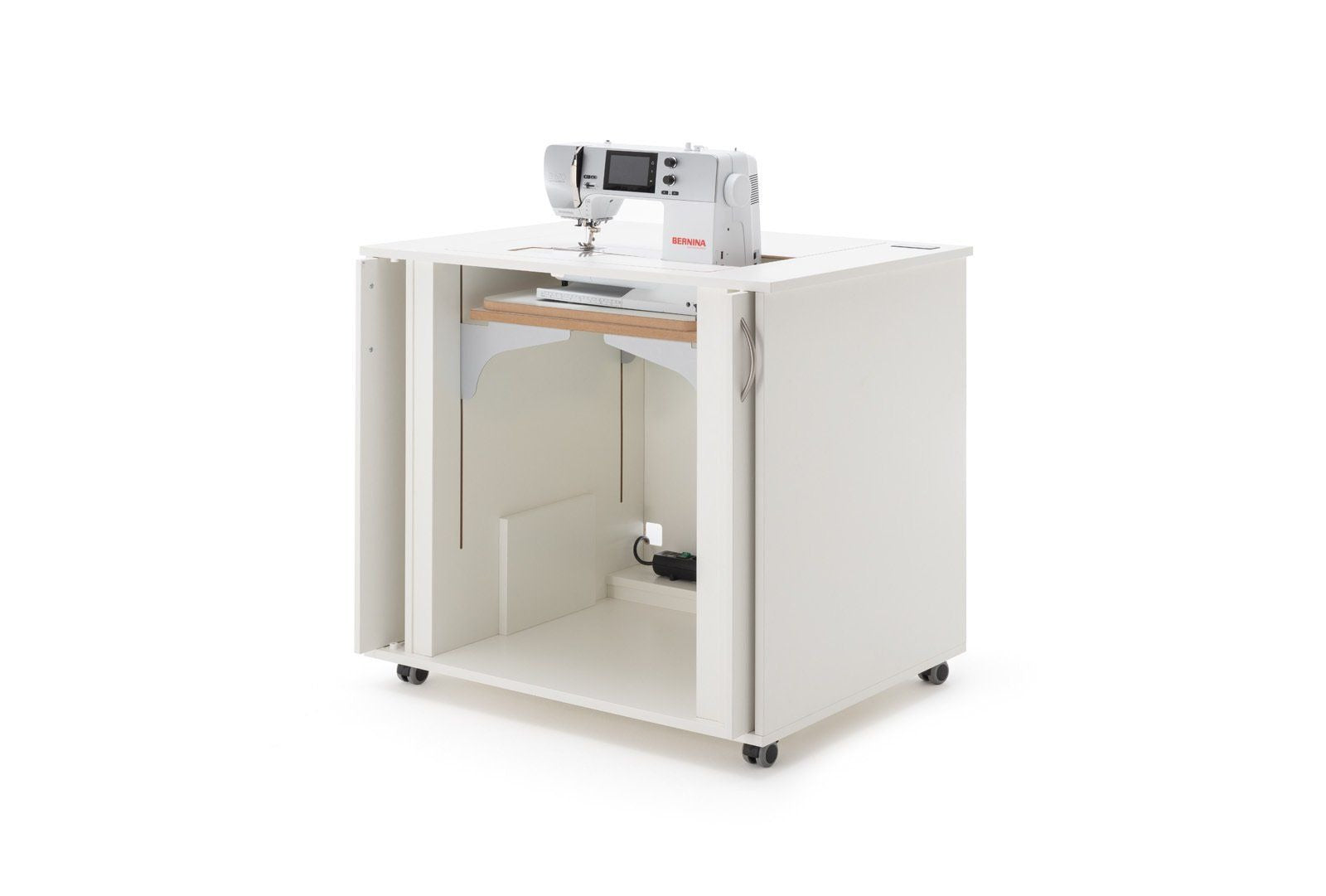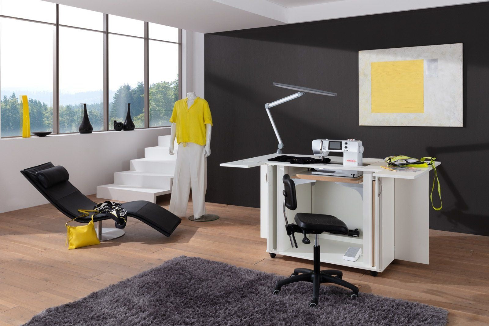Unsere Revolution zum Nähen und Quilten in 90° auf einem Level, mit dem von uns entwickelten Schiebe-, und Drehmechanismus. Die Maschine kann auf dem Liftbrett um 90 Grad zwangsgeführt verdreht werden kann. Somit ist ein Quilten wie mit einer Longarm-Quiltmaschine möglich. Die für Ihre Maschine passende Freiarmeinlage ob quer oder in 90° gedreht bieten wir für alle Haushalt-Nähmaschinen an. Egal ob Sie Freiarm Nähen, Sticken, oder Ihre Maschine komplett versenken wollen, die beiden gekoppelten elektronisch gesteuerte RMF – easy-Softtech Lift bewegen jedes Maschinengewicht mühelos und bieten absolute Stabilität in jeder Lage. Das in der Platte eingelassene i-Touch Bedienfeld mit Lock-, zwei Momoryfunktionen , und einer Auf und Ab Funktion runden die Bedienung ab. Durch den neuen großen RMF – Simply-7 Ausschnitt ist der Nähtisch kompatibel für alle Haushalt-Nämaschinen. Die beiden Einschiebetüren verschwinden fast unsichtbar in das Innere des Möbels. Mit unserer Stuhlserie CHAIR one und CHAIR two sitzen Sie auch an diesem Möbel immer in der ergonomisch perfekten Höhe und Haltung.