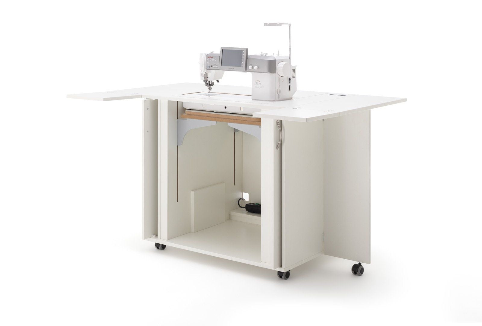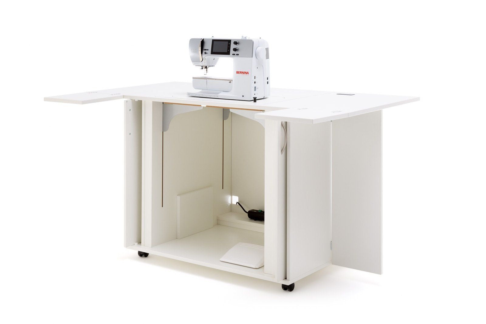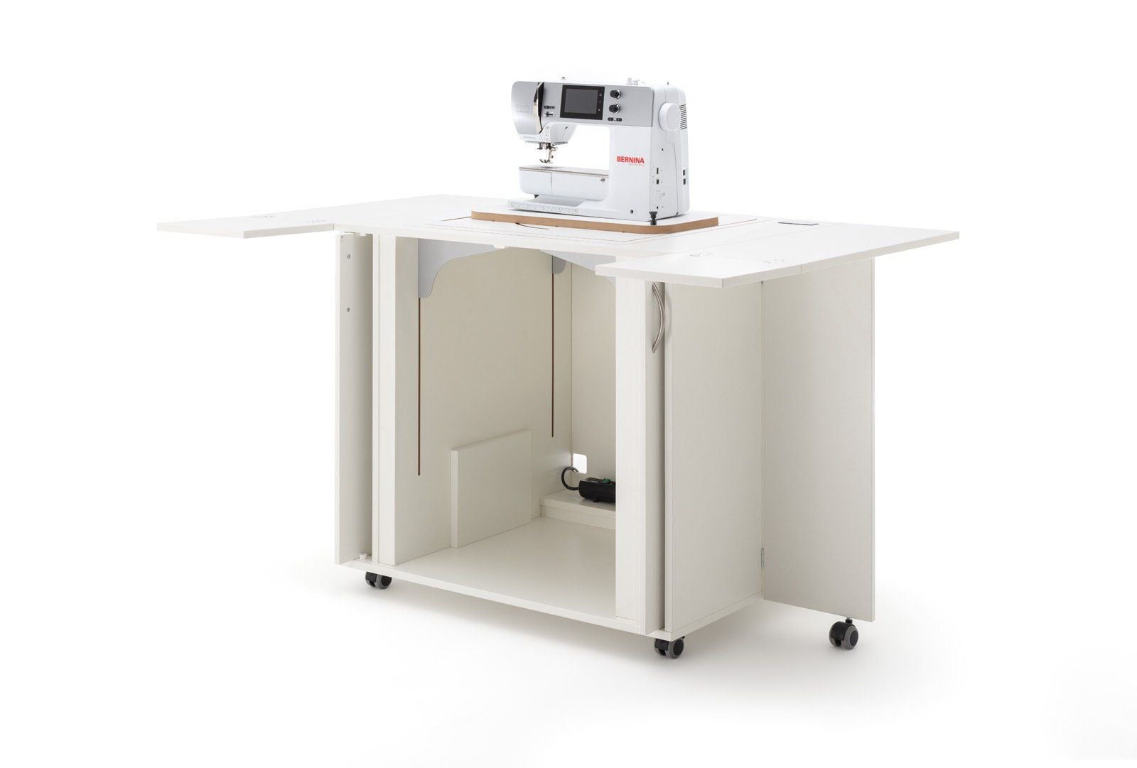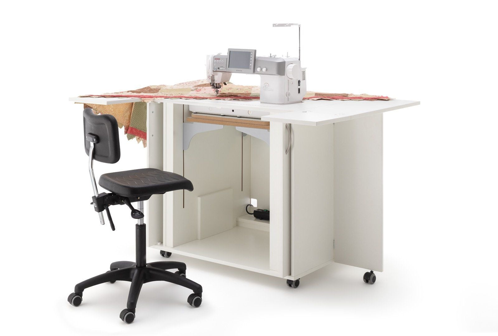 Die Weiterentwicklung zum TWIN fix mit den Kapp-, und Faltplatten. Unsere Revolution zum Nähen und Quilten in 90° auf einem Level, mit dem von uns entwickelten Schiebe-, und Drehmechanismus. Die Maschine kann auf dem Liftbrett um 90 Grad zwangsgeführt verdreht werden kann. Somit ist ein Quilten wie mit einer Longarm-Quiltmaschine möglich. Die für Ihre Maschine passende Freiarmeinlage ob quer oder in 90° gedreht bieten wir für alle Haushalt-Nähmaschinen an. Egal ob Sie Freiarm Nähen, Sticken, oder Ihre Maschine komplett versenken wollen, die beiden gekoppelten elektronisch gesteuerte RMF – easy-Softtech Lift bewegen jedes Maschinengewicht mühelos und bieten absolute Stabilität in jeder Lage. Das in der Platte eingelassene i-Touch Bedienfeld mit Lock-, zwei Momoryfunktionen und einer auf und ab Funktion runden die Bedienung ab. Durch den neuen großen RMF – Simply-7 Ausschnitt ist der Nähtisch kompatibel für alle Haushalt-Nämaschinen. Die auf eine 1600 x 1060 mm erweiterbare Arbeitsfläche bietet Platz für jede Quiltgröße. Beide Einschiebetüren verschwinden fast unsichtbar in das Innere des Möbels. Mit unserer Stuhlserie CHAIR one und CHAIR two sitzen Sie auch an diesem Möbel immer in der ergonomisch perfekten Höhe und Haltung.
