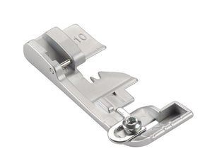 Der Standard-Nähfuss #L10 kann für Overlockarbeiten eingesetzt werden, bei denen die Stoffkante in einem Arbeitsgang zurückgeschnitten und versäubert wird. Der Nähfuss hat eine verstellbare und offene Bandführung.